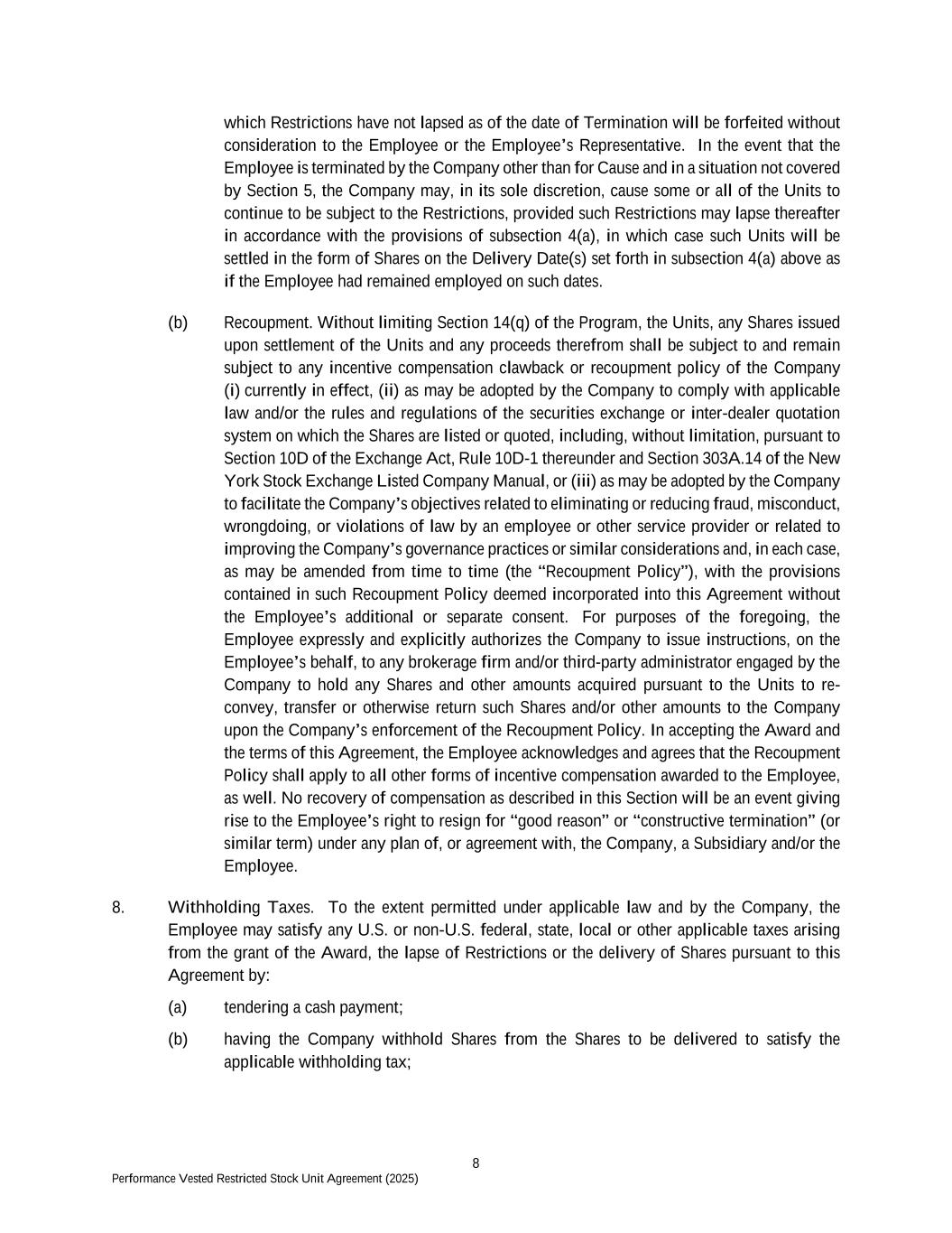 8 Performance Vested Restricted Stock Unit Agreement (2025) which Restrictions have not lapsed as of the date of Termination will be forfeited without consideration to the Employee or the Employee’s Representative. In the event that the Employee is terminated by the Company other than for Cause and in a situation not covered by Section 5, the Company may, in its sole discretion, cause some or all of the Units to continue to be subject to the Restrictions, provided such Restrictions may lapse thereafter in accordance with the provisions of subsection 4(a), in which case such Units will be settled in the form of Shares on the Delivery Date(s) set forth in subsection 4(a) above as if the Employee had remained employed on such dates. (b) Recoupment. Without limiting Section 14(q) of the Program, the Units, any Shares issued upon settlement of the Units and any proceeds therefrom shall be subject to and remain subject to any incentive compensation clawback or recoupment policy of the Company (i) currently in effect, (ii) as may be adopted by the Company to comply with applicable law and/or the rules and regulations of the securities exchange or inter-dealer quotation system on which the Shares are listed or quoted, including, without limitation, pursuant to Section 10D of the Exchange Act, Rule 10D-1 thereunder and Section 303A.14 of the New York Stock Exchange Listed Company Manual, or (iii) as may be adopted by the Company to facilitate the Company’s objectives related to eliminating or reducing fraud, misconduct, wrongdoing, or violations of law by an employee or other service provider or related to improving the Company’s governance practices or similar considerations and, in each case, as may be amended from time to time (the “Recoupment Policy”), with the provisions contained in such Recoupment Policy deemed incorporated into this Agreement without the Employee’s additional or separate consent. For purposes of the foregoing, the Employee expressly and explicitly authorizes the Company to issue instructions, on the Employee’s behalf, to any brokerage firm and/or third-party administrator engaged by the Company to hold any Shares and other amounts acquired pursuant to the Units to re- convey, transfer or otherwise return such Shares and/or other amounts to the Company upon the Company’s enforcement of the Recoupment Policy. In accepting the Award and the terms of this Agreement, the Employee acknowledges and agrees that the Recoupment Policy shall apply to all other forms of incentive compensation awarded to the Employee, as well. No recovery of compensation as described in this Section will be an event giving rise to the Employee’s right to resign for “good reason” or “constructive termination” (or similar term) under any plan of, or agreement with, the Company, a Subsidiary and/or the Employee. 8. Withholding Taxes. To the extent permitted under applicable law and by the Company, the Employee may satisfy any U.S. or non-U.S. federal, state, local or other applicable taxes arising from the grant of the Award, the lapse of Restrictions or the delivery of Shares pursuant to this Agreement by: (a) tendering a cash payment; (b) having the Company withhold Shares from the Shares to be delivered to satisfy the applicable withholding tax;