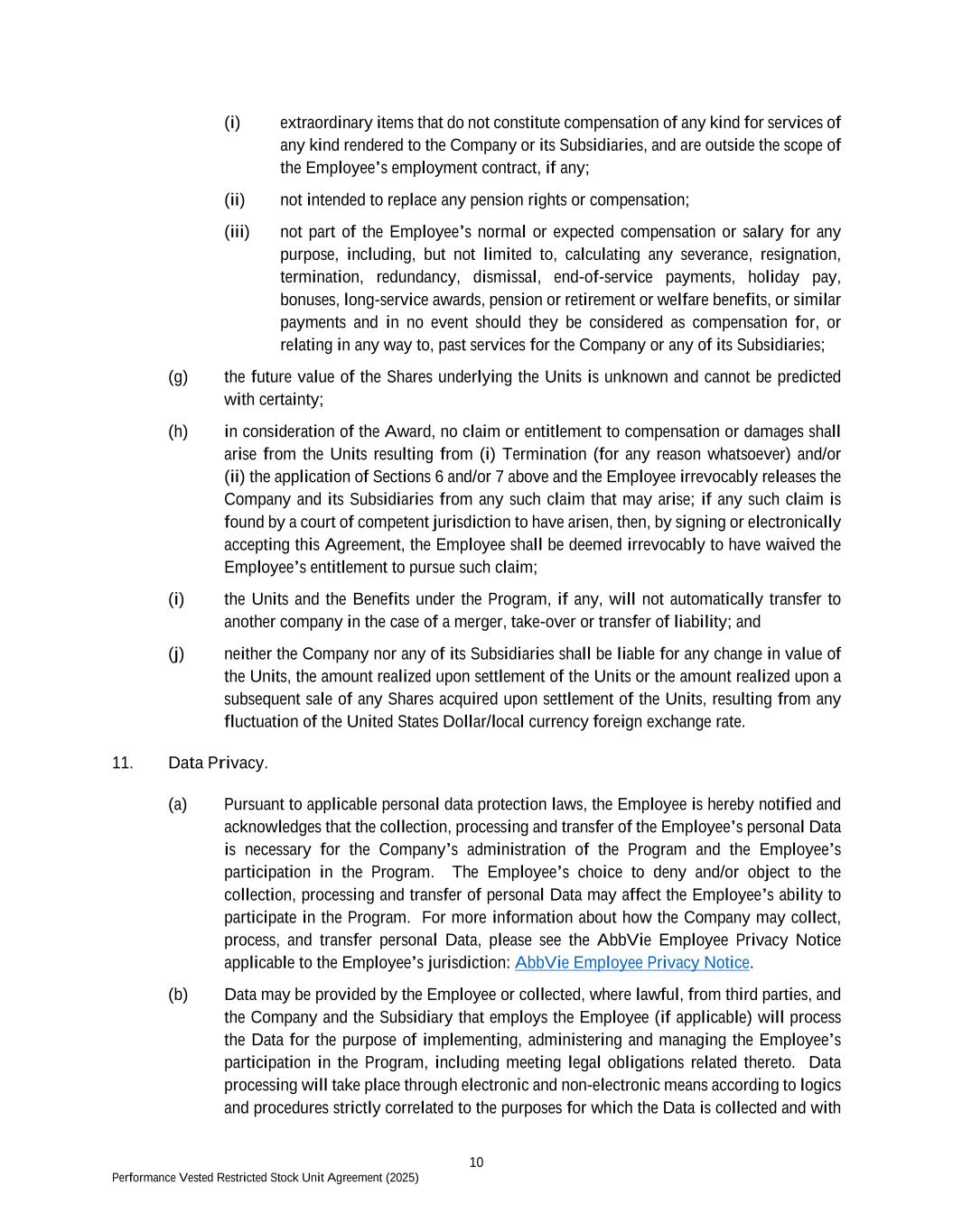 10 Performance Vested Restricted Stock Unit Agreement (2025) (i) extraordinary items that do not constitute compensation of any kind for services of any kind rendered to the Company or its Subsidiaries, and are outside the scope of the Employee’s employment contract, if any; (ii) not intended to replace any pension rights or compensation; (iii) not part of the Employee’s normal or expected compensation or salary for any purpose, including, but not limited to, calculating any severance, resignation, termination, redundancy, dismissal, end-of-service payments, holiday pay, bonuses, long-service awards, pension or retirement or welfare benefits, or similar payments and in no event should they be considered as compensation for, or relating in any way to, past services for the Company or any of its Subsidiaries; (g) the future value of the Shares underlying the Units is unknown and cannot be predicted with certainty; (h) in consideration of the Award, no claim or entitlement to compensation or damages shall arise from the Units resulting from (i) Termination (for any reason whatsoever) and/or (ii) the application of Sections 6 and/or 7 above and the Employee irrevocably releases the Company and its Subsidiaries from any such claim that may arise; if any such claim is found by a court of competent jurisdiction to have arisen, then, by signing or electronically accepting this Agreement, the Employee shall be deemed irrevocably to have waived the Employee’s entitlement to pursue such claim; (i) the Units and the Benefits under the Program, if any, will not automatically transfer to another company in the case of a merger, take-over or transfer of liability; and (j) neither the Company nor any of its Subsidiaries shall be liable for any change in value of the Units, the amount realized upon settlement of the Units or the amount realized upon a subsequent sale of any Shares acquired upon settlement of the Units, resulting from any fluctuation of the United States Dollar/local currency foreign exchange rate. 11. Data Privacy. (a) Pursuant to applicable personal data protection laws, the Employee is hereby notified and acknowledges that the collection, processing and transfer of the Employee’s personal Data is necessary for the Company’s administration of the Program and the Employee’s participation in the Program. The Employee’s choice to deny and/or object to the collection, processing and transfer of personal Data may affect the Employee’s ability to participate in the Program. For more information about how the Company may collect, process, and transfer personal Data, please see the AbbVie Employee Privacy Notice applicable to the Employee’s jurisdiction: AbbVie Employee Privacy Notice. (b) Data may be provided by the Employee or collected, where lawful, from third parties, and the Company and the Subsidiary that employs the Employee (if applicable) will process the Data for the purpose of implementing, administering and managing the Employee’s participation in the Program, including meeting legal obligations related thereto. Data processing will take place through electronic and non-electronic means according to logics and procedures strictly correlated to the purposes for which the Data is collected and with