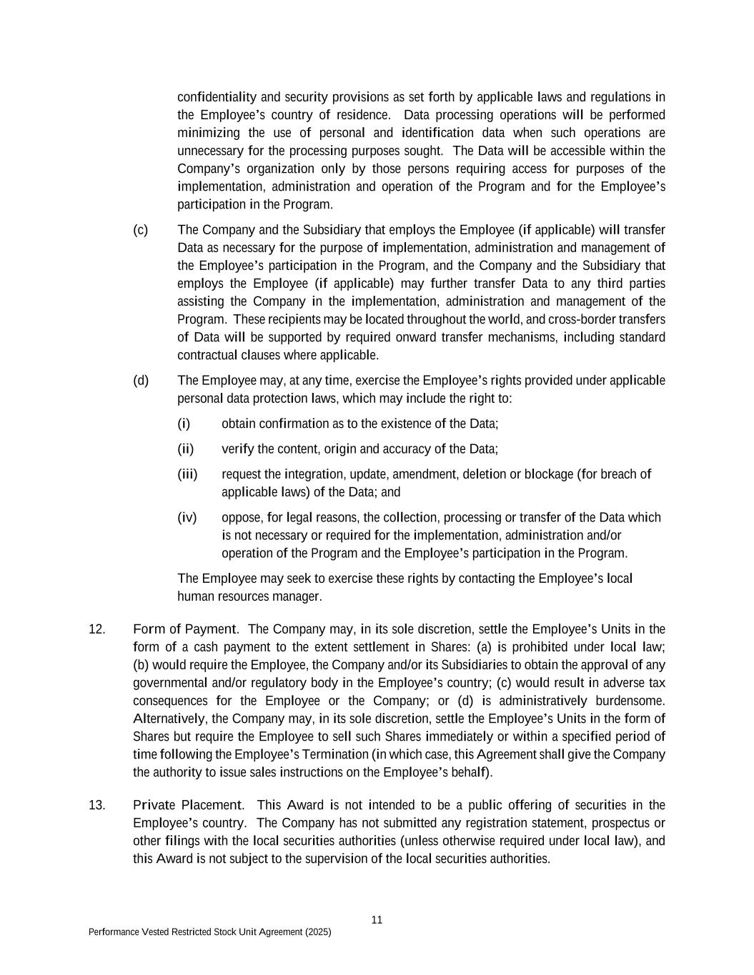 11 Performance Vested Restricted Stock Unit Agreement (2025) confidentiality and security provisions as set forth by applicable laws and regulations in the Employee’s country of residence. Data processing operations will be performed minimizing the use of personal and identification data when such operations are unnecessary for the processing purposes sought. The Data will be accessible within the Company’s organization only by those persons requiring access for purposes of the implementation, administration and operation of the Program and for the Employee’s participation in the Program. (c) The Company and the Subsidiary that employs the Employee (if applicable) will transfer Data as necessary for the purpose of implementation, administration and management of the Employee’s participation in the Program, and the Company and the Subsidiary that employs the Employee (if applicable) may further transfer Data to any third parties assisting the Company in the implementation, administration and management of the Program. These recipients may be located throughout the world, and cross-border transfers of Data will be supported by required onward transfer mechanisms, including standard contractual clauses where applicable. (d) The Employee may, at any time, exercise the Employee’s rights provided under applicable personal data protection laws, which may include the right to: (i) obtain confirmation as to the existence of the Data; (ii) verify the content, origin and accuracy of the Data; (iii) request the integration, update, amendment, deletion or blockage (for breach of applicable laws) of the Data; and (iv) oppose, for legal reasons, the collection, processing or transfer of the Data which is not necessary or required for the implementation, administration and/or operation of the Program and the Employee’s participation in the Program. The Employee may seek to exercise these rights by contacting the Employee’s local human resources manager. 12. Form of Payment. The Company may, in its sole discretion, settle the Employee’s Units in the form of a cash payment to the extent settlement in Shares: (a) is prohibited under local law; (b) would require the Employee, the Company and/or its Subsidiaries to obtain the approval of any governmental and/or regulatory body in the Employee’s country; (c) would result in adverse tax consequences for the Employee or the Company; or (d) is administratively burdensome. Alternatively, the Company may, in its sole discretion, settle the Employee’s Units in the form of Shares but require the Employee to sell such Shares immediately or within a specified period of time following the Employee’s Termination (in which case, this Agreement shall give the Company the authority to issue sales instructions on the Employee’s behalf). 13. Private Placement. This Award is not intended to be a public offering of securities in the Employee’s country. The Company has not submitted any registration statement, prospectus or other filings with the local securities authorities (unless otherwise required under local law), and this Award is not subject to the supervision of the local securities authorities.