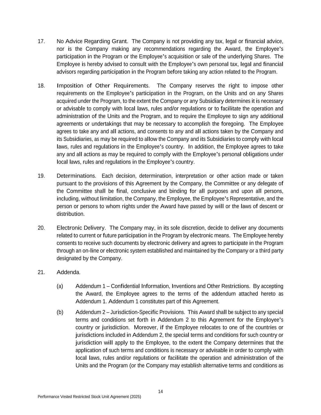 14 Performance Vested Restricted Stock Unit Agreement (2025) 17. No Advice Regarding Grant. The Company is not providing any tax, legal or financial advice, nor is the Company making any recommendations regarding the Award, the Employee’s participation in the Program or the Employee’s acquisition or sale of the underlying Shares. The Employee is hereby advised to consult with the Employee’s own personal tax, legal and financial advisors regarding participation in the Program before taking any action related to the Program. 18. Imposition of Other Requirements. The Company reserves the right to impose other requirements on the Employee’s participation in the Program, on the Units and on any Shares acquired under the Program, to the extent the Company or any Subsidiary determines it is necessary or advisable to comply with local laws, rules and/or regulations or to facilitate the operation and administration of the Units and the Program, and to require the Employee to sign any additional agreements or undertakings that may be necessary to accomplish the foregoing. The Employee agrees to take any and all actions, and consents to any and all actions taken by the Company and its Subsidiaries, as may be required to allow the Company and its Subsidiaries to comply with local laws, rules and regulations in the Employee’s country. In addition, the Employee agrees to take any and all actions as may be required to comply with the Employee’s personal obligations under local laws, rules and regulations in the Employee’s country. 19. Determinations. Each decision, determination, interpretation or other action made or taken pursuant to the provisions of this Agreement by the Company, the Committee or any delegate of the Committee shall be final, conclusive and binding for all purposes and upon all persons, including, without limitation, the Company, the Employee, the Employee’s Representative, and the person or persons to whom rights under the Award have passed by will or the laws of descent or distribution. 20. Electronic Delivery. The Company may, in its sole discretion, decide to deliver any documents related to current or future participation in the Program by electronic means. The Employee hereby consents to receive such documents by electronic delivery and agrees to participate in the Program through an on-line or electronic system established and maintained by the Company or a third party designated by the Company. 21. Addenda. (a) Addendum 1 – Confidential Information, Inventions and Other Restrictions. By accepting the Award, the Employee agrees to the terms of the addendum attached hereto as Addendum 1. Addendum 1 constitutes part of this Agreement. (b) Addendum 2 – Jurisdiction-Specific Provisions. This Award shall be subject to any special terms and conditions set forth in Addendum 2 to this Agreement for the Employee’s country or jurisdiction. Moreover, if the Employee relocates to one of the countries or jurisdictions included in Addendum 2, the special terms and conditions for such country or jurisdiction will apply to the Employee, to the extent the Company determines that the application of such terms and conditions is necessary or advisable in order to comply with local laws, rules and/or regulations or facilitate the operation and administration of the Units and the Program (or the Company may establish alternative terms and conditions as