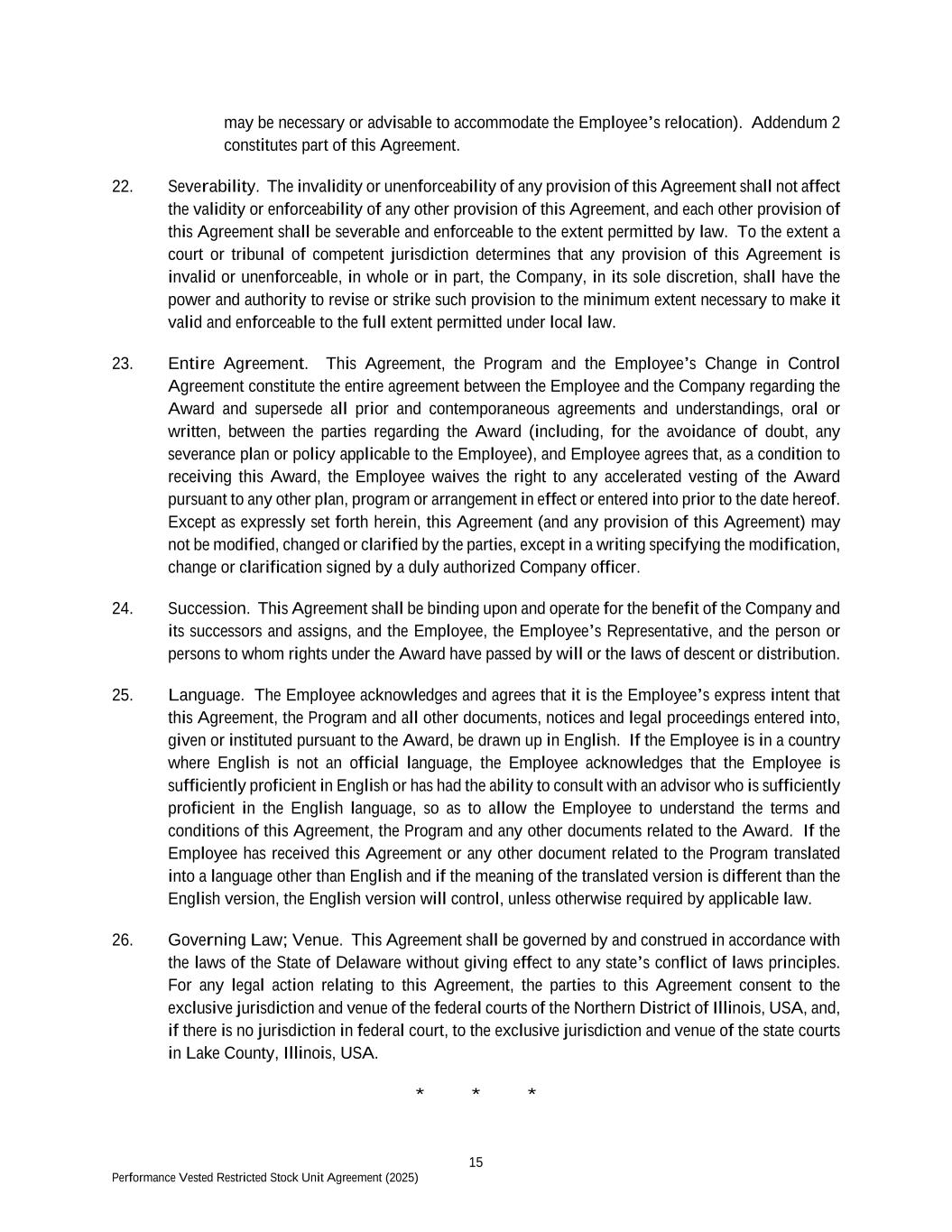 15 Performance Vested Restricted Stock Unit Agreement (2025) may be necessary or advisable to accommodate the Employee’s relocation). Addendum 2 constitutes part of this Agreement. 22. Severability. The invalidity or unenforceability of any provision of this Agreement shall not affect the validity or enforceability of any other provision of this Agreement, and each other provision of this Agreement shall be severable and enforceable to the extent permitted by law. To the extent a court or tribunal of competent jurisdiction determines that any provision of this Agreement is invalid or unenforceable, in whole or in part, the Company, in its sole discretion, shall have the power and authority to revise or strike such provision to the minimum extent necessary to make it valid and enforceable to the full extent permitted under local law. 23. Entire Agreement. This Agreement, the Program and the Employee’s Change in Control Agreement constitute the entire agreement between the Employee and the Company regarding the Award and supersede all prior and contemporaneous agreements and understandings, oral or written, between the parties regarding the Award (including, for the avoidance of doubt, any severance plan or policy applicable to the Employee), and Employee agrees that, as a condition to receiving this Award, the Employee waives the right to any accelerated vesting of the Award pursuant to any other plan, program or arrangement in effect or entered into prior to the date hereof. Except as expressly set forth herein, this Agreement (and any provision of this Agreement) may not be modified, changed or clarified by the parties, except in a writing specifying the modification, change or clarification signed by a duly authorized Company officer. 24. Succession. This Agreement shall be binding upon and operate for the benefit of the Company and its successors and assigns, and the Employee, the Employee’s Representative, and the person or persons to whom rights under the Award have passed by will or the laws of descent or distribution. 25. Language. The Employee acknowledges and agrees that it is the Employee’s express intent that this Agreement, the Program and all other documents, notices and legal proceedings entered into, given or instituted pursuant to the Award, be drawn up in English. If the Employee is in a country where English is not an official language, the Employee acknowledges that the Employee is sufficiently proficient in English or has had the ability to consult with an advisor who is sufficiently proficient in the English language, so as to allow the Employee to understand the terms and conditions of this Agreement, the Program and any other documents related to the Award. If the Employee has received this Agreement or any other document related to the Program translated into a language other than English and if the meaning of the translated version is different than the English version, the English version will control, unless otherwise required by applicable law. 26. Governing Law; Venue. This Agreement shall be governed by and construed in accordance with the laws of the State of Delaware without giving effect to any state’s conflict of laws principles. For any legal action relating to this Agreement, the parties to this Agreement consent to the exclusive jurisdiction and venue of the federal courts of the Northern District of Illinois, USA, and, if there is no jurisdiction in federal court, to the exclusive jurisdiction and venue of the state courts in Lake County, Illinois, USA. * * *