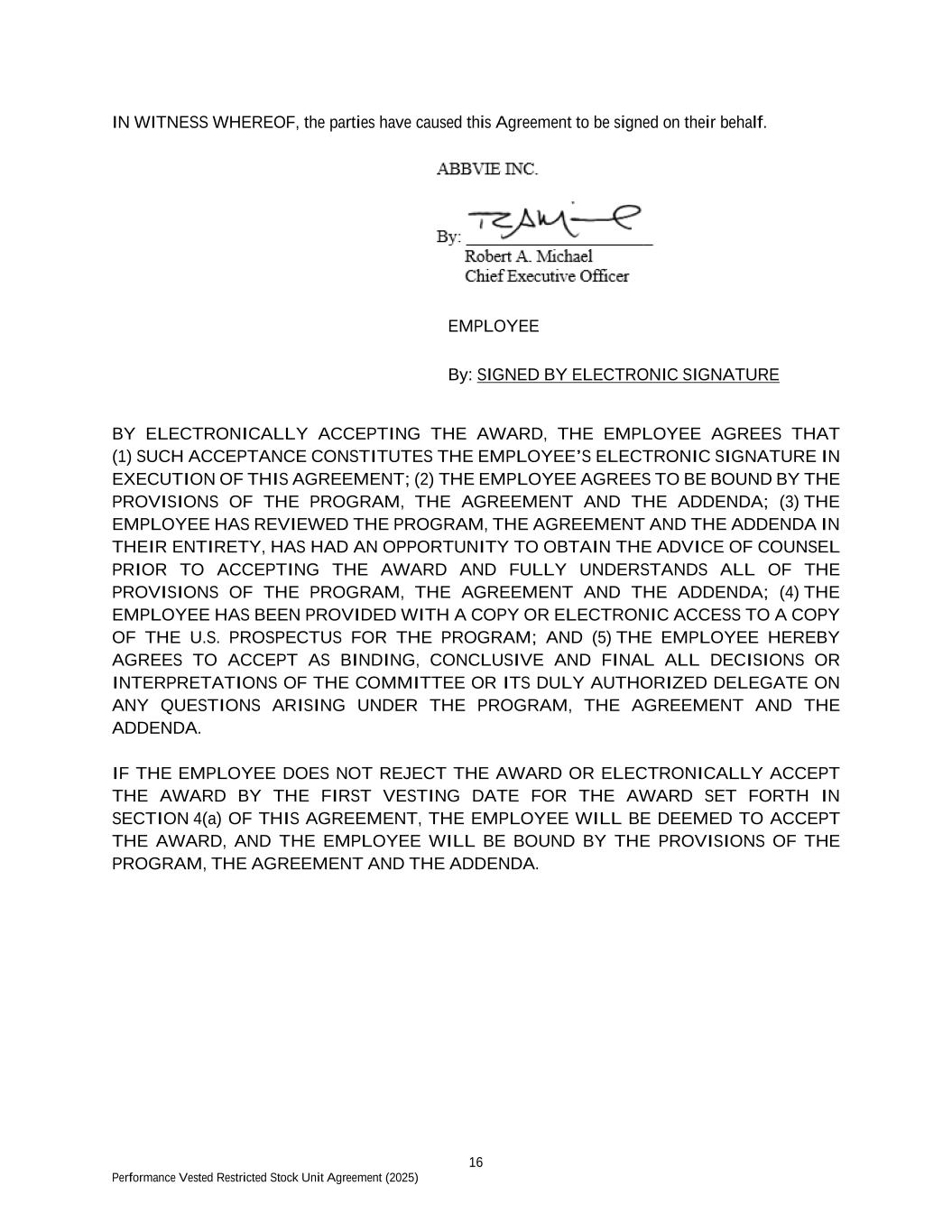 16 Performance Vested Restricted Stock Unit Agreement (2025) IN WITNESS WHEREOF, the parties have caused this Agreement to be signed on their behalf. EMPLOYEE By: SIGNED BY ELECTRONIC SIGNATURE BY ELECTRONICALLY ACCEPTING THE AWARD, THE EMPLOYEE AGREES THAT (1) SUCH ACCEPTANCE CONSTITUTES THE EMPLOYEE’S ELECTRONIC SIGNATURE IN EXECUTION OF THIS AGREEMENT; (2) THE EMPLOYEE AGREES TO BE BOUND BY THE PROVISIONS OF THE PROGRAM, THE AGREEMENT AND THE ADDENDA; (3) THE EMPLOYEE HAS REVIEWED THE PROGRAM, THE AGREEMENT AND THE ADDENDA IN THEIR ENTIRETY, HAS HAD AN OPPORTUNITY TO OBTAIN THE ADVICE OF COUNSEL PRIOR TO ACCEPTING THE AWARD AND FULLY UNDERSTANDS ALL OF THE PROVISIONS OF THE PROGRAM, THE AGREEMENT AND THE ADDENDA; (4) THE EMPLOYEE HAS BEEN PROVIDED WITH A COPY OR ELECTRONIC ACCESS TO A COPY OF THE U.S. PROSPECTUS FOR THE PROGRAM; AND (5) THE EMPLOYEE HEREBY AGREES TO ACCEPT AS BINDING, CONCLUSIVE AND FINAL ALL DECISIONS OR INTERPRETATIONS OF THE COMMITTEE OR ITS DULY AUTHORIZED DELEGATE ON ANY QUESTIONS ARISING UNDER THE PROGRAM, THE AGREEMENT AND THE ADDENDA. IF THE EMPLOYEE DOES NOT REJECT THE AWARD OR ELECTRONICALLY ACCEPT THE AWARD BY THE FIRST VESTING DATE FOR THE AWARD SET FORTH IN SECTION 4(a) OF THIS AGREEMENT, THE EMPLOYEE WILL BE DEEMED TO ACCEPT THE AWARD, AND THE EMPLOYEE WILL BE BOUND BY THE PROVISIONS OF THE PROGRAM, THE AGREEMENT AND THE ADDENDA.