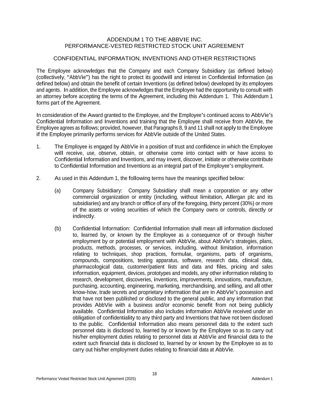 18 Performance Vested Restricted Stock Unit Agreement (2025) Addendum 1 ADDENDUM 1 TO THE ABBVIE INC. PERFORMANCE-VESTED RESTRICTED STOCK UNIT AGREEMENT CONFIDENTIAL INFORMATION, INVENTIONS AND OTHER RESTRICTIONS The Employee acknowledges that the Company and each Company Subsidiary (as defined below) (collectively, “AbbVie”) has the right to protect its goodwill and interest in Confidential Information (as defined below) and obtain the benefit of certain Inventions (as defined below) developed by its employees and agents. In addition, the Employee acknowledges that the Employee had the opportunity to consult with an attorney before accepting the terms of the Agreement, including this Addendum 1. This Addendum 1 forms part of the Agreement. In consideration of the Award granted to the Employee, and the Employee’s continued access to AbbVie’s Confidential Information and Inventions and training that the Employee shall receive from AbbVie, the Employee agrees as follows; provided, however, that Paragraphs 8, 9 and 11 shall not apply to the Employee if the Employee primarily performs services for AbbVie outside of the United States. 1. The Employee is engaged by AbbVie in a position of trust and confidence in which the Employee will receive, use, observe, obtain, or otherwise come into contact with or have access to Confidential Information and Inventions, and may invent, discover, initiate or otherwise contribute to Confidential Information and Inventions as an integral part of the Employee’s employment. 2. As used in this Addendum 1, the following terms have the meanings specified below: (a) Company Subsidiary: Company Subsidiary shall mean a corporation or any other commercial organization or entity (including, without limitation, Allergan plc and its subsidiaries) and any branch or office of any of the foregoing, thirty percent (30%) or more of the assets or voting securities of which the Company owns or controls, directly or indirectly. (b) Confidential Information: Confidential Information shall mean all information disclosed to, learned by, or known by the Employee as a consequence of or through his/her employment by or potential employment with AbbVie, about AbbVie’s strategies, plans, products, methods, processes, or services, including, without limitation, information relating to techniques, shop practices, formulae, organisms, parts of organisms, compounds, compositions, testing apparatus, software, research data, clinical data, pharmacological data, customer/patient lists and data and files, pricing and sales information, equipment, devices, prototypes and models, any other information relating to research, development, discoveries, inventions, improvements, innovations, manufacture, purchasing, accounting, engineering, marketing, merchandising, and selling, and all other know-how, trade secrets and proprietary information that are in AbbVie’s possession and that have not been published or disclosed to the general public, and any information that provides AbbVie with a business and/or economic benefit from not being publicly available. Confidential Information also includes information AbbVie received under an obligation of confidentiality to any third party and Inventions that have not been disclosed to the public. Confidential Information also means personnel data to the extent such personnel data is disclosed to, learned by or known by the Employee so as to carry out his/her employment duties relating to personnel data at AbbVie and financial data to the extent such financial data is disclosed to, learned by or known by the Employee so as to carry out his/her employment duties relating to financial data at AbbVie.
