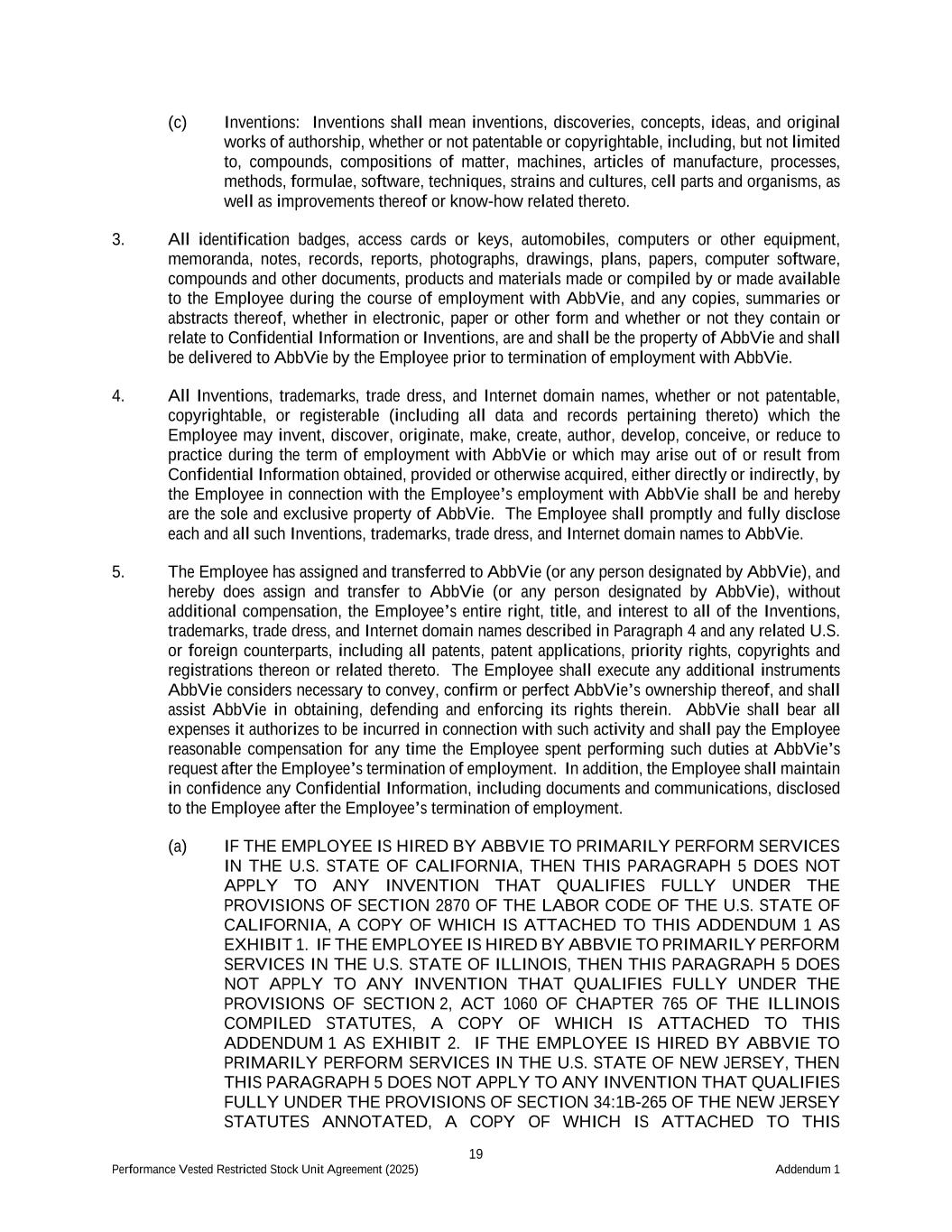 19 Performance Vested Restricted Stock Unit Agreement (2025) Addendum 1 (c) Inventions: Inventions shall mean inventions, discoveries, concepts, ideas, and original works of authorship, whether or not patentable or copyrightable, including, but not limited to, compounds, compositions of matter, machines, articles of manufacture, processes, methods, formulae, software, techniques, strains and cultures, cell parts and organisms, as well as improvements thereof or know-how related thereto. 3. All identification badges, access cards or keys, automobiles, computers or other equipment, memoranda, notes, records, reports, photographs, drawings, plans, papers, computer software, compounds and other documents, products and materials made or compiled by or made available to the Employee during the course of employment with AbbVie, and any copies, summaries or abstracts thereof, whether in electronic, paper or other form and whether or not they contain or relate to Confidential Information or Inventions, are and shall be the property of AbbVie and shall be delivered to AbbVie by the Employee prior to termination of employment with AbbVie. 4. All Inventions, trademarks, trade dress, and Internet domain names, whether or not patentable, copyrightable, or registerable (including all data and records pertaining thereto) which the Employee may invent, discover, originate, make, create, author, develop, conceive, or reduce to practice during the term of employment with AbbVie or which may arise out of or result from Confidential Information obtained, provided or otherwise acquired, either directly or indirectly, by the Employee in connection with the Employee’s employment with AbbVie shall be and hereby are the sole and exclusive property of AbbVie. The Employee shall promptly and fully disclose each and all such Inventions, trademarks, trade dress, and Internet domain names to AbbVie. 5. The Employee has assigned and transferred to AbbVie (or any person designated by AbbVie), and hereby does assign and transfer to AbbVie (or any person designated by AbbVie), without additional compensation, the Employee’s entire right, title, and interest to all of the Inventions, trademarks, trade dress, and Internet domain names described in Paragraph 4 and any related U.S. or foreign counterparts, including all patents, patent applications, priority rights, copyrights and registrations thereon or related thereto. The Employee shall execute any additional instruments AbbVie considers necessary to convey, confirm or perfect AbbVie’s ownership thereof, and shall assist AbbVie in obtaining, defending and enforcing its rights therein. AbbVie shall bear all expenses it authorizes to be incurred in connection with such activity and shall pay the Employee reasonable compensation for any time the Employee spent performing such duties at AbbVie’s request after the Employee’s termination of employment. In addition, the Employee shall maintain in confidence any Confidential Information, including documents and communications, disclosed to the Employee after the Employee’s termination of employment. (a) IF THE EMPLOYEE IS HIRED BY ABBVIE TO PRIMARILY PERFORM SERVICES IN THE U.S. STATE OF CALIFORNIA, THEN THIS PARAGRAPH 5 DOES NOT APPLY TO ANY INVENTION THAT QUALIFIES FULLY UNDER THE PROVISIONS OF SECTION 2870 OF THE LABOR CODE OF THE U.S. STATE OF CALIFORNIA, A COPY OF WHICH IS ATTACHED TO THIS ADDENDUM 1 AS EXHIBIT 1. IF THE EMPLOYEE IS HIRED BY ABBVIE TO PRIMARILY PERFORM SERVICES IN THE U.S. STATE OF ILLINOIS, THEN THIS PARAGRAPH 5 DOES NOT APPLY TO ANY INVENTION THAT QUALIFIES FULLY UNDER THE PROVISIONS OF SECTION 2, ACT 1060 OF CHAPTER 765 OF THE ILLINOIS COMPILED STATUTES, A COPY OF WHICH IS ATTACHED TO THIS ADDENDUM 1 AS EXHIBIT 2. IF THE EMPLOYEE IS HIRED BY ABBVIE TO PRIMARILY PERFORM SERVICES IN THE U.S. STATE OF NEW JERSEY, THEN THIS PARAGRAPH 5 DOES NOT APPLY TO ANY INVENTION THAT QUALIFIES FULLY UNDER THE PROVISIONS OF SECTION 34:1B-265 OF THE NEW JERSEY STATUTES ANNOTATED, A COPY OF WHICH IS ATTACHED TO THIS