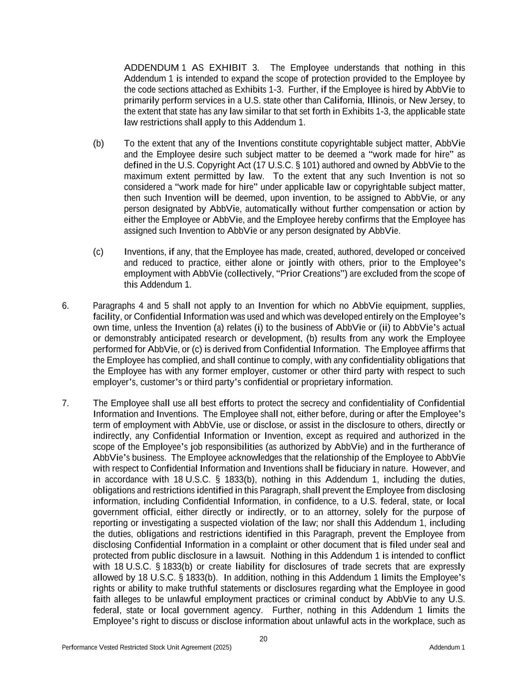 20 Performance Vested Restricted Stock Unit Agreement (2025) Addendum 1 ADDENDUM 1 AS EXHIBIT 3. The Employee understands that nothing in this Addendum 1 is intended to expand the scope of protection provided to the Employee by the code sections attached as Exhibits 1-3. Further, if the Employee is hired by AbbVie to primarily perform services in a U.S. state other than California, Illinois, or New Jersey, to the extent that state has any law similar to that set forth in Exhibits 1-3, the applicable state law restrictions shall apply to this Addendum 1. (b) To the extent that any of the Inventions constitute copyrightable subject matter, AbbVie and the Employee desire such subject matter to be deemed a “work made for hire” as defined in the U.S. Copyright Act (17 U.S.C. § 101) authored and owned by AbbVie to the maximum extent permitted by law. To the extent that any such Invention is not so considered a “work made for hire” under applicable law or copyrightable subject matter, then such Invention will be deemed, upon invention, to be assigned to AbbVie, or any person designated by AbbVie, automatically without further compensation or action by either the Employee or AbbVie, and the Employee hereby confirms that the Employee has assigned such Invention to AbbVie or any person designated by AbbVie. (c) Inventions, if any, that the Employee has made, created, authored, developed or conceived and reduced to practice, either alone or jointly with others, prior to the Employee’s employment with AbbVie (collectively, “Prior Creations”) are excluded from the scope of this Addendum 1. 6. Paragraphs 4 and 5 shall not apply to an Invention for which no AbbVie equipment, supplies, facility, or Confidential Information was used and which was developed entirely on the Employee’s own time, unless the Invention (a) relates (i) to the business of AbbVie or (ii) to AbbVie’s actual or demonstrably anticipated research or development, (b) results from any work the Employee performed for AbbVie, or (c) is derived from Confidential Information. The Employee affirms that the Employee has complied, and shall continue to comply, with any confidentiality obligations that the Employee has with any former employer, customer or other third party with respect to such employer’s, customer’s or third party’s confidential or proprietary information. 7. The Employee shall use all best efforts to protect the secrecy and confidentiality of Confidential Information and Inventions. The Employee shall not, either before, during or after the Employee’s term of employment with AbbVie, use or disclose, or assist in the disclosure to others, directly or indirectly, any Confidential Information or Invention, except as required and authorized in the scope of the Employee’s job responsibilities (as authorized by AbbVie) and in the furtherance of AbbVie’s business. The Employee acknowledges that the relationship of the Employee to AbbVie with respect to Confidential Information and Inventions shall be fiduciary in nature. However, and in accordance with 18 U.S.C. § 1833(b), nothing in this Addendum 1, including the duties, obligations and restrictions identified in this Paragraph, shall prevent the Employee from disclosing information, including Confidential Information, in confidence, to a U.S. federal, state, or local government official, either directly or indirectly, or to an attorney, solely for the purpose of reporting or investigating a suspected violation of the law; nor shall this Addendum 1, including the duties, obligations and restrictions identified in this Paragraph, prevent the Employee from disclosing Confidential Information in a complaint or other document that is filed under seal and protected from public disclosure in a lawsuit. Nothing in this Addendum 1 is intended to conflict with 18 U.S.C. § 1833(b) or create liability for disclosures of trade secrets that are expressly allowed by 18 U.S.C. § 1833(b). In addition, nothing in this Addendum 1 limits the Employee’s rights or ability to make truthful statements or disclosures regarding what the Employee in good faith alleges to be unlawful employment practices or criminal conduct by AbbVie to any U.S. federal, state or local government agency. Further, nothing in this Addendum 1 limits the Employee’s right to discuss or disclose information about unlawful acts in the workplace, such as