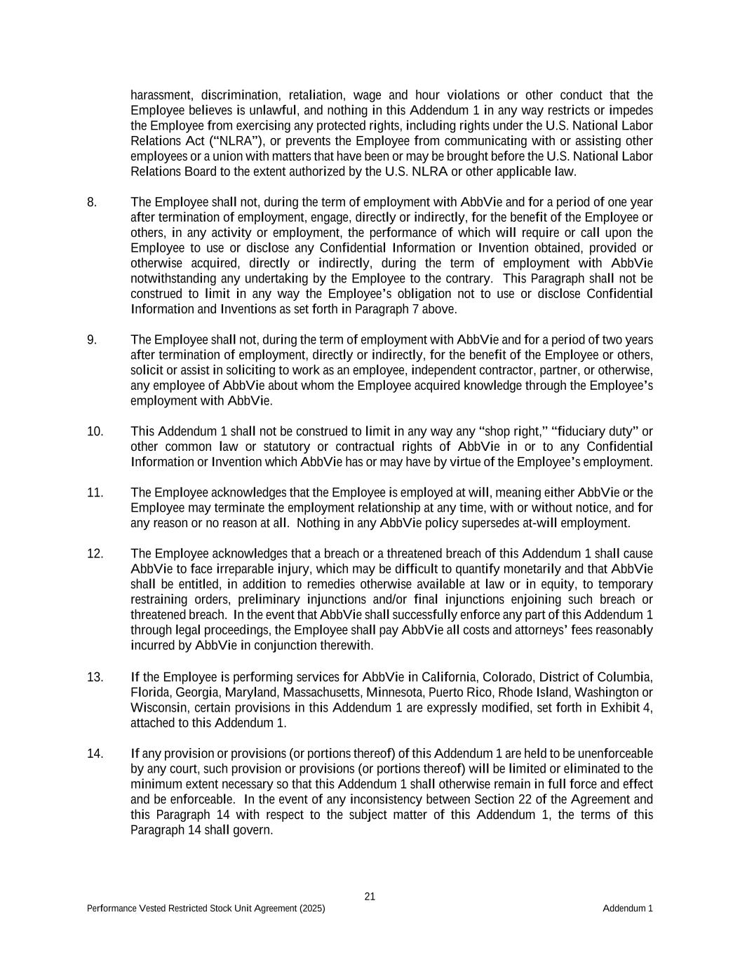 21 Performance Vested Restricted Stock Unit Agreement (2025) Addendum 1 harassment, discrimination, retaliation, wage and hour violations or other conduct that the Employee believes is unlawful, and nothing in this Addendum 1 in any way restricts or impedes the Employee from exercising any protected rights, including rights under the U.S. National Labor Relations Act (“NLRA”), or prevents the Employee from communicating with or assisting other employees or a union with matters that have been or may be brought before the U.S. National Labor Relations Board to the extent authorized by the U.S. NLRA or other applicable law. 8. The Employee shall not, during the term of employment with AbbVie and for a period of one year after termination of employment, engage, directly or indirectly, for the benefit of the Employee or others, in any activity or employment, the performance of which will require or call upon the Employee to use or disclose any Confidential Information or Invention obtained, provided or otherwise acquired, directly or indirectly, during the term of employment with AbbVie notwithstanding any undertaking by the Employee to the contrary. This Paragraph shall not be construed to limit in any way the Employee’s obligation not to use or disclose Confidential Information and Inventions as set forth in Paragraph 7 above. 9. The Employee shall not, during the term of employment with AbbVie and for a period of two years after termination of employment, directly or indirectly, for the benefit of the Employee or others, solicit or assist in soliciting to work as an employee, independent contractor, partner, or otherwise, any employee of AbbVie about whom the Employee acquired knowledge through the Employee’s employment with AbbVie. 10. This Addendum 1 shall not be construed to limit in any way any “shop right,” “fiduciary duty” or other common law or statutory or contractual rights of AbbVie in or to any Confidential Information or Invention which AbbVie has or may have by virtue of the Employee’s employment. 11. The Employee acknowledges that the Employee is employed at will, meaning either AbbVie or the Employee may terminate the employment relationship at any time, with or without notice, and for any reason or no reason at all. Nothing in any AbbVie policy supersedes at-will employment. 12. The Employee acknowledges that a breach or a threatened breach of this Addendum 1 shall cause AbbVie to face irreparable injury, which may be difficult to quantify monetarily and that AbbVie shall be entitled, in addition to remedies otherwise available at law or in equity, to temporary restraining orders, preliminary injunctions and/or final injunctions enjoining such breach or threatened breach. In the event that AbbVie shall successfully enforce any part of this Addendum 1 through legal proceedings, the Employee shall pay AbbVie all costs and attorneys’ fees reasonably incurred by AbbVie in conjunction therewith. 13. If the Employee is performing services for AbbVie in California, Colorado, District of Columbia, Florida, Georgia, Maryland, Massachusetts, Minnesota, Puerto Rico, Rhode Island, Washington or Wisconsin, certain provisions in this Addendum 1 are expressly modified, set forth in Exhibit 4, attached to this Addendum 1. 14. If any provision or provisions (or portions thereof) of this Addendum 1 are held to be unenforceable by any court, such provision or provisions (or portions thereof) will be limited or eliminated to the minimum extent necessary so that this Addendum 1 shall otherwise remain in full force and effect and be enforceable. In the event of any inconsistency between Section 22 of the Agreement and this Paragraph 14 with respect to the subject matter of this Addendum 1, the terms of this Paragraph 14 shall govern.