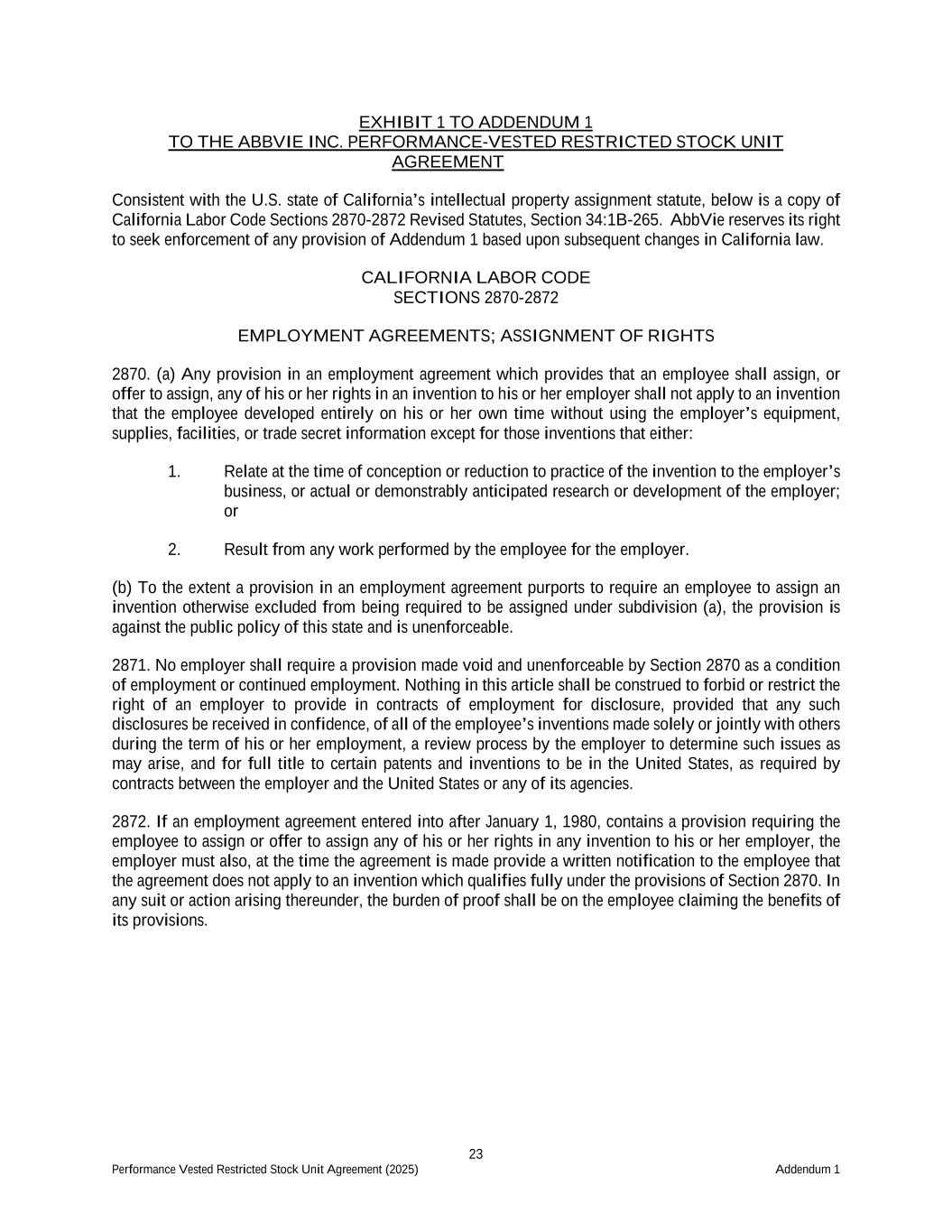 23 Performance Vested Restricted Stock Unit Agreement (2025) Addendum 1 EXHIBIT 1 TO ADDENDUM 1 TO THE ABBVIE INC. PERFORMANCE-VESTED RESTRICTED STOCK UNIT AGREEMENT Consistent with the U.S. state of California’s intellectual property assignment statute, below is a copy of California Labor Code Sections 2870-2872 Revised Statutes, Section 34:1B-265. AbbVie reserves its right to seek enforcement of any provision of Addendum 1 based upon subsequent changes in California law. CALIFORNIA LABOR CODE SECTIONS 2870-2872 EMPLOYMENT AGREEMENTS; ASSIGNMENT OF RIGHTS 2870. (a) Any provision in an employment agreement which provides that an employee shall assign, or offer to assign, any of his or her rights in an invention to his or her employer shall not apply to an invention that the employee developed entirely on his or her own time without using the employer’s equipment, supplies, facilities, or trade secret information except for those inventions that either: 1. Relate at the time of conception or reduction to practice of the invention to the employer’s business, or actual or demonstrably anticipated research or development of the employer; or 2. Result from any work performed by the employee for the employer. (b) To the extent a provision in an employment agreement purports to require an employee to assign an invention otherwise excluded from being required to be assigned under subdivision (a), the provision is against the public policy of this state and is unenforceable. 2871. No employer shall require a provision made void and unenforceable by Section 2870 as a condition of employment or continued employment. Nothing in this article shall be construed to forbid or restrict the right of an employer to provide in contracts of employment for disclosure, provided that any such disclosures be received in confidence, of all of the employee’s inventions made solely or jointly with others during the term of his or her employment, a review process by the employer to determine such issues as may arise, and for full title to certain patents and inventions to be in the United States, as required by contracts between the employer and the United States or any of its agencies. 2872. If an employment agreement entered into after January 1, 1980, contains a provision requiring the employee to assign or offer to assign any of his or her rights in any invention to his or her employer, the employer must also, at the time the agreement is made provide a written notification to the employee that the agreement does not apply to an invention which qualifies fully under the provisions of Section 2870. In any suit or action arising thereunder, the burden of proof shall be on the employee claiming the benefits of its provisions.