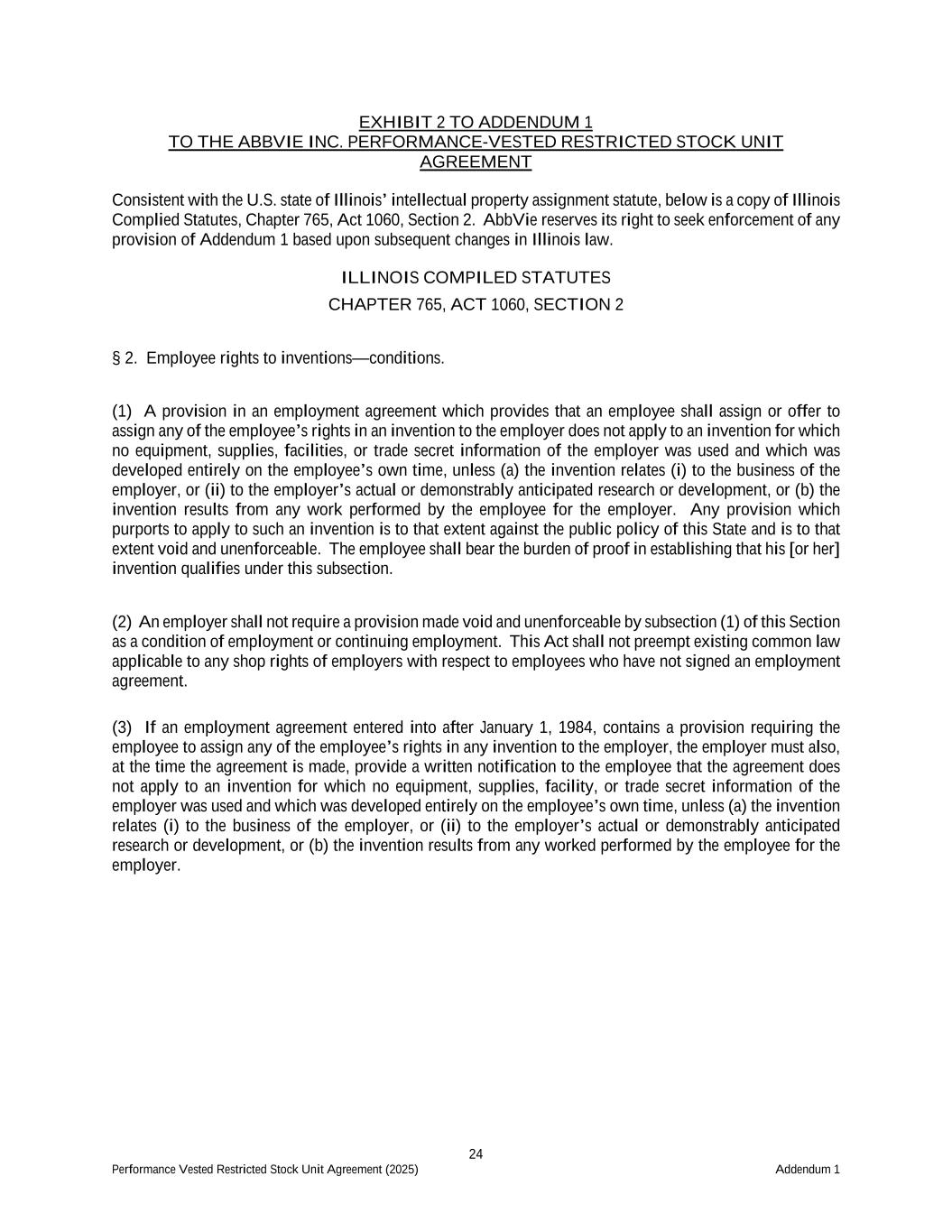 24 Performance Vested Restricted Stock Unit Agreement (2025) Addendum 1 EXHIBIT 2 TO ADDENDUM 1 TO THE ABBVIE INC. PERFORMANCE-VESTED RESTRICTED STOCK UNIT AGREEMENT Consistent with the U.S. state of Illinois’ intellectual property assignment statute, below is a copy of Illinois Complied Statutes, Chapter 765, Act 1060, Section 2. AbbVie reserves its right to seek enforcement of any provision of Addendum 1 based upon subsequent changes in Illinois law. ILLINOIS COMPILED STATUTES CHAPTER 765, ACT 1060, SECTION 2 § 2. Employee rights to inventions—conditions. (1) A provision in an employment agreement which provides that an employee shall assign or offer to assign any of the employee’s rights in an invention to the employer does not apply to an invention for which no equipment, supplies, facilities, or trade secret information of the employer was used and which was developed entirely on the employee’s own time, unless (a) the invention relates (i) to the business of the employer, or (ii) to the employer’s actual or demonstrably anticipated research or development, or (b) the invention results from any work performed by the employee for the employer. Any provision which purports to apply to such an invention is to that extent against the public policy of this State and is to that extent void and unenforceable. The employee shall bear the burden of proof in establishing that his [or her] invention qualifies under this subsection. (2) An employer shall not require a provision made void and unenforceable by subsection (1) of this Section as a condition of employment or continuing employment. This Act shall not preempt existing common law applicable to any shop rights of employers with respect to employees who have not signed an employment agreement. (3) If an employment agreement entered into after January 1, 1984, contains a provision requiring the employee to assign any of the employee’s rights in any invention to the employer, the employer must also, at the time the agreement is made, provide a written notification to the employee that the agreement does not apply to an invention for which no equipment, supplies, facility, or trade secret information of the employer was used and which was developed entirely on the employee’s own time, unless (a) the invention relates (i) to the business of the employer, or (ii) to the employer’s actual or demonstrably anticipated research or development, or (b) the invention results from any worked performed by the employee for the employer.
