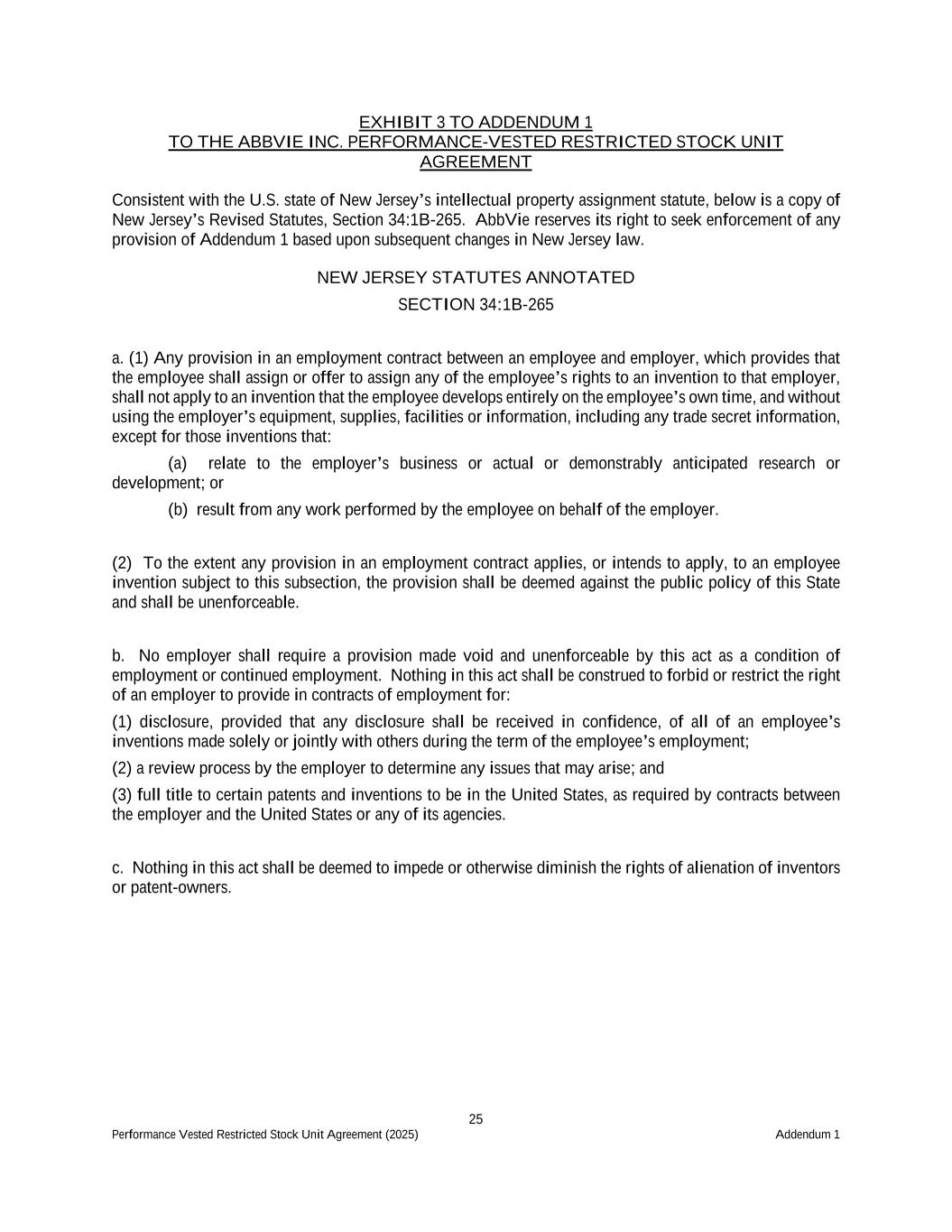 25 Performance Vested Restricted Stock Unit Agreement (2025) Addendum 1 EXHIBIT 3 TO ADDENDUM 1 TO THE ABBVIE INC. PERFORMANCE-VESTED RESTRICTED STOCK UNIT AGREEMENT Consistent with the U.S. state of New Jersey’s intellectual property assignment statute, below is a copy of New Jersey’s Revised Statutes, Section 34:1B-265. AbbVie reserves its right to seek enforcement of any provision of Addendum 1 based upon subsequent changes in New Jersey law. NEW JERSEY STATUTES ANNOTATED SECTION 34:1B-265 a. (1) Any provision in an employment contract between an employee and employer, which provides that the employee shall assign or offer to assign any of the employee’s rights to an invention to that employer, shall not apply to an invention that the employee develops entirely on the employee’s own time, and without using the employer’s equipment, supplies, facilities or information, including any trade secret information, except for those inventions that: (a) relate to the employer’s business or actual or demonstrably anticipated research or development; or (b) result from any work performed by the employee on behalf of the employer. (2) To the extent any provision in an employment contract applies, or intends to apply, to an employee invention subject to this subsection, the provision shall be deemed against the public policy of this State and shall be unenforceable. b. No employer shall require a provision made void and unenforceable by this act as a condition of employment or continued employment. Nothing in this act shall be construed to forbid or restrict the right of an employer to provide in contracts of employment for: (1) disclosure, provided that any disclosure shall be received in confidence, of all of an employee’s inventions made solely or jointly with others during the term of the employee’s employment; (2) a review process by the employer to determine any issues that may arise; and (3) full title to certain patents and inventions to be in the United States, as required by contracts between the employer and the United States or any of its agencies. c. Nothing in this act shall be deemed to impede or otherwise diminish the rights of alienation of inventors or patent-owners.