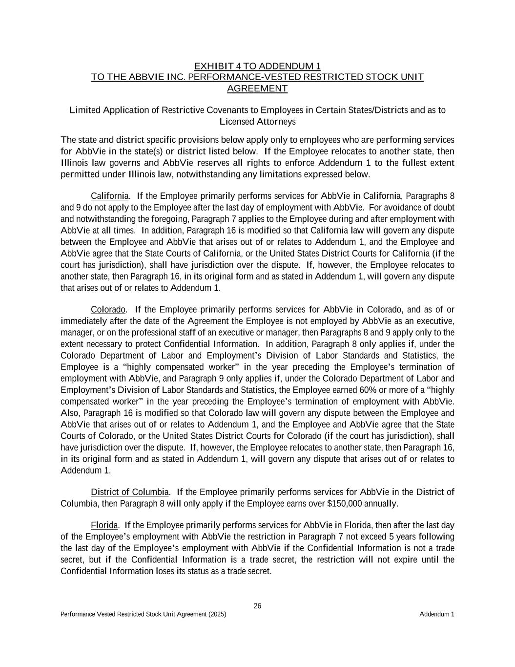26 Performance Vested Restricted Stock Unit Agreement (2025) Addendum 1 EXHIBIT 4 TO ADDENDUM 1 TO THE ABBVIE INC. PERFORMANCE-VESTED RESTRICTED STOCK UNIT AGREEMENT Limited Application of Restrictive Covenants to Employees in Certain States/Districts and as to Licensed Attorneys The state and district specific provisions below apply only to employees who are performing services for AbbVie in the state(s) or district listed below. If the Employee relocates to another state, then Illinois law governs and AbbVie reserves all rights to enforce Addendum 1 to the fullest extent permitted under Illinois law, notwithstanding any limitations expressed below. California. If the Employee primarily performs services for AbbVie in California, Paragraphs 8 and 9 do not apply to the Employee after the last day of employment with AbbVie. For avoidance of doubt and notwithstanding the foregoing, Paragraph 7 applies to the Employee during and after employment with AbbVie at all times. In addition, Paragraph 16 is modified so that California law will govern any dispute between the Employee and AbbVie that arises out of or relates to Addendum 1, and the Employee and AbbVie agree that the State Courts of California, or the United States District Courts for California (if the court has jurisdiction), shall have jurisdiction over the dispute. If, however, the Employee relocates to another state, then Paragraph 16, in its original form and as stated in Addendum 1, will govern any dispute that arises out of or relates to Addendum 1. Colorado. If the Employee primarily performs services for AbbVie in Colorado, and as of or immediately after the date of the Agreement the Employee is not employed by AbbVie as an executive, manager, or on the professional staff of an executive or manager, then Paragraphs 8 and 9 apply only to the extent necessary to protect Confidential Information. In addition, Paragraph 8 only applies if, under the Colorado Department of Labor and Employment’s Division of Labor Standards and Statistics, the Employee is a “highly compensated worker” in the year preceding the Employee’s termination of employment with AbbVie, and Paragraph 9 only applies if, under the Colorado Department of Labor and Employment’s Division of Labor Standards and Statistics, the Employee earned 60% or more of a “highly compensated worker” in the year preceding the Employee’s termination of employment with AbbVie. Also, Paragraph 16 is modified so that Colorado law will govern any dispute between the Employee and AbbVie that arises out of or relates to Addendum 1, and the Employee and AbbVie agree that the State Courts of Colorado, or the United States District Courts for Colorado (if the court has jurisdiction), shall have jurisdiction over the dispute. If, however, the Employee relocates to another state, then Paragraph 16, in its original form and as stated in Addendum 1, will govern any dispute that arises out of or relates to Addendum 1. District of Columbia. If the Employee primarily performs services for AbbVie in the District of Columbia, then Paragraph 8 will only apply if the Employee earns over $150,000 annually. Florida. If the Employee primarily performs services for AbbVie in Florida, then after the last day of the Employee’s employment with AbbVie the restriction in Paragraph 7 not exceed 5 years following the last day of the Employee’s employment with AbbVie if the Confidential Information is not a trade secret, but if the Confidential Information is a trade secret, the restriction will not expire until the Confidential Information loses its status as a trade secret.