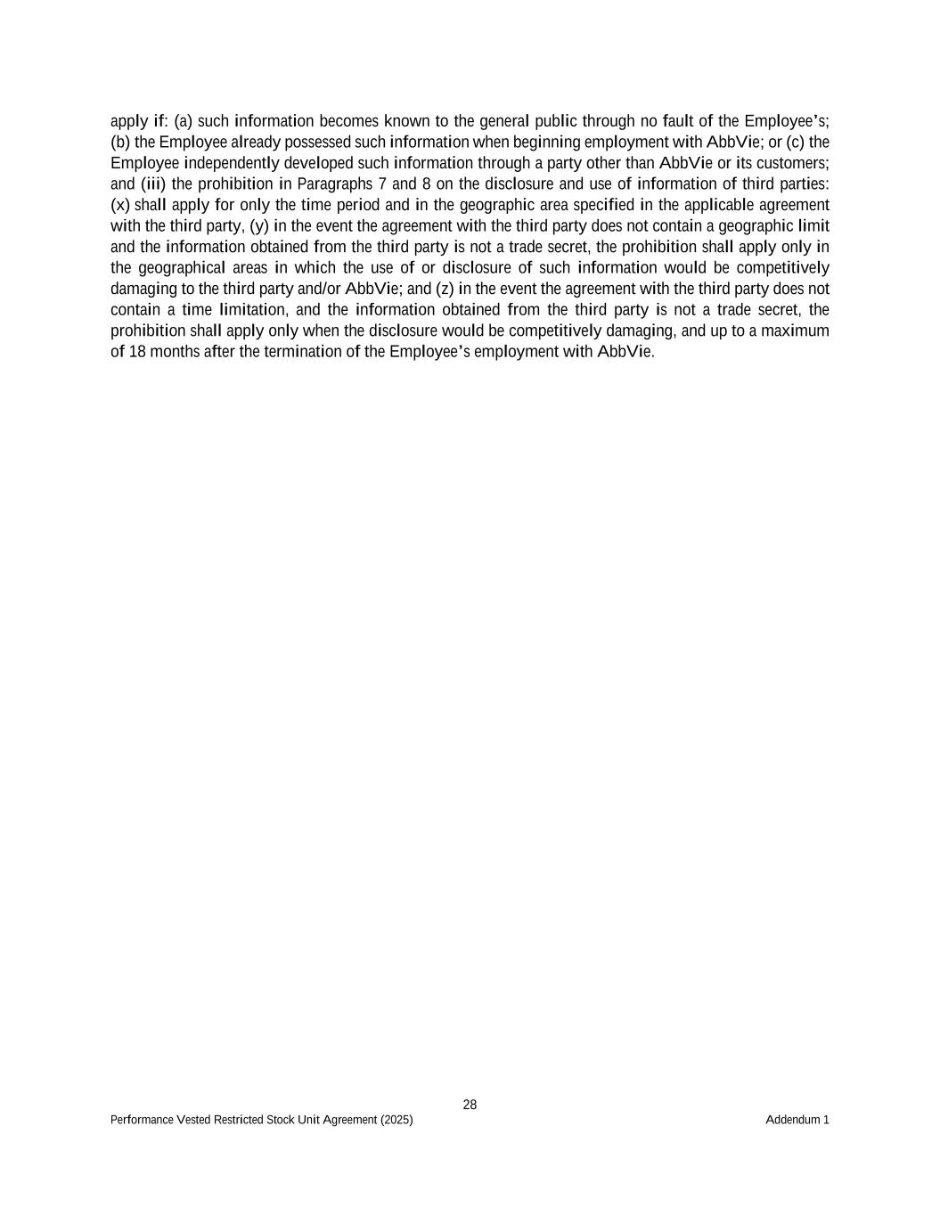 28 Performance Vested Restricted Stock Unit Agreement (2025) Addendum 1 apply if: (a) such information becomes known to the general public through no fault of the Employee’s; (b) the Employee already possessed such information when beginning employment with AbbVie; or (c) the Employee independently developed such information through a party other than AbbVie or its customers; and (iii) the prohibition in Paragraphs 7 and 8 on the disclosure and use of information of third parties: (x) shall apply for only the time period and in the geographic area specified in the applicable agreement with the third party, (y) in the event the agreement with the third party does not contain a geographic limit and the information obtained from the third party is not a trade secret, the prohibition shall apply only in the geographical areas in which the use of or disclosure of such information would be competitively damaging to the third party and/or AbbVie; and (z) in the event the agreement with the third party does not contain a time limitation, and the information obtained from the third party is not a trade secret, the prohibition shall apply only when the disclosure would be competitively damaging, and up to a maximum of 18 months after the termination of the Employee’s employment with AbbVie.