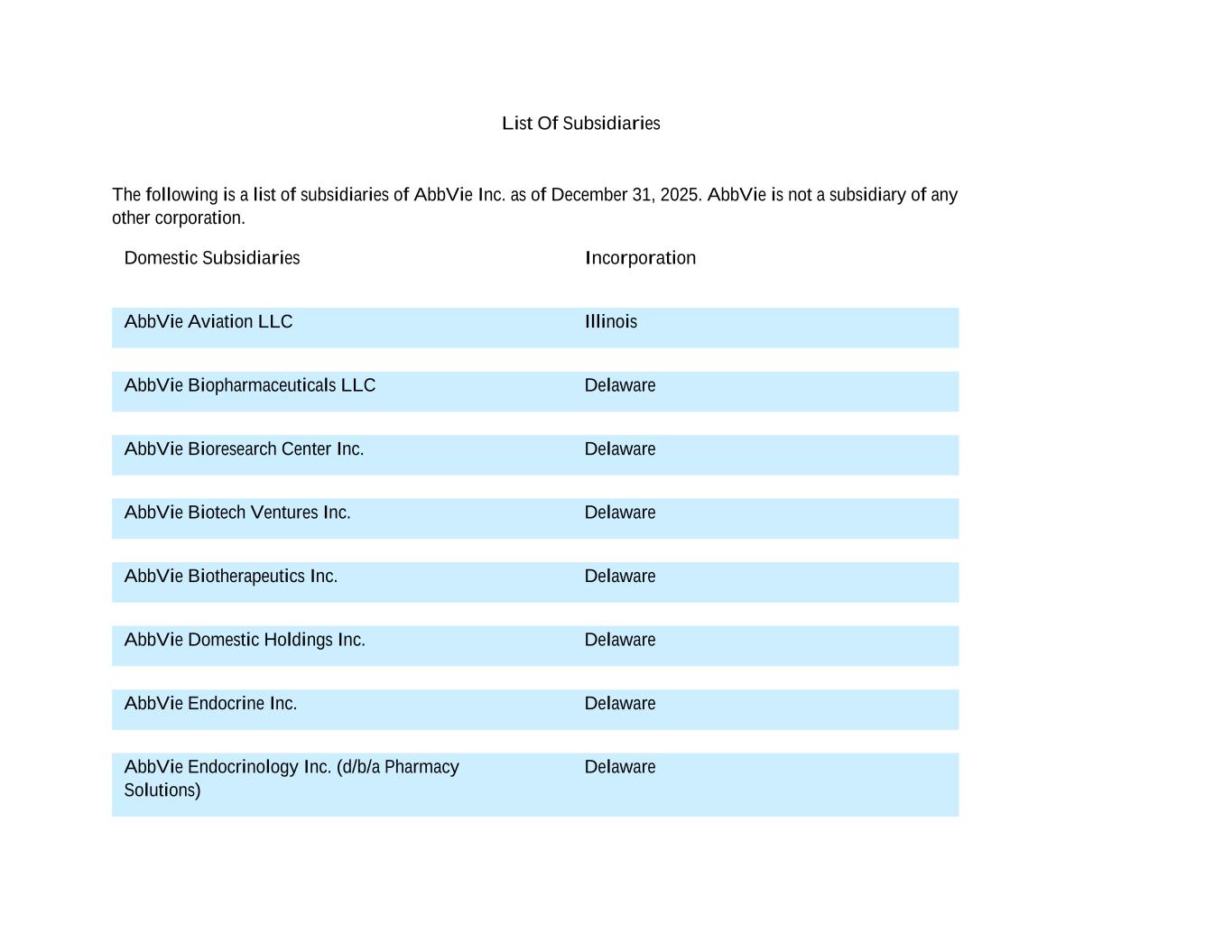 List Of Subsidiaries The following is a list of subsidiaries of AbbVie Inc. as of December 31, 2025. AbbVie is not a subsidiary of any other corporation. Domestic Subsidiaries Incorporation AbbVie Aviation LLC Illinois AbbVie Biopharmaceuticals LLC Delaware AbbVie Bioresearch Center Inc. Delaware AbbVie Biotech Ventures Inc. Delaware AbbVie Biotherapeutics Inc. Delaware AbbVie Domestic Holdings Inc. Delaware AbbVie Endocrine Inc. Delaware AbbVie Endocrinology Inc. (d/b/a Pharmacy Solutions) Delaware