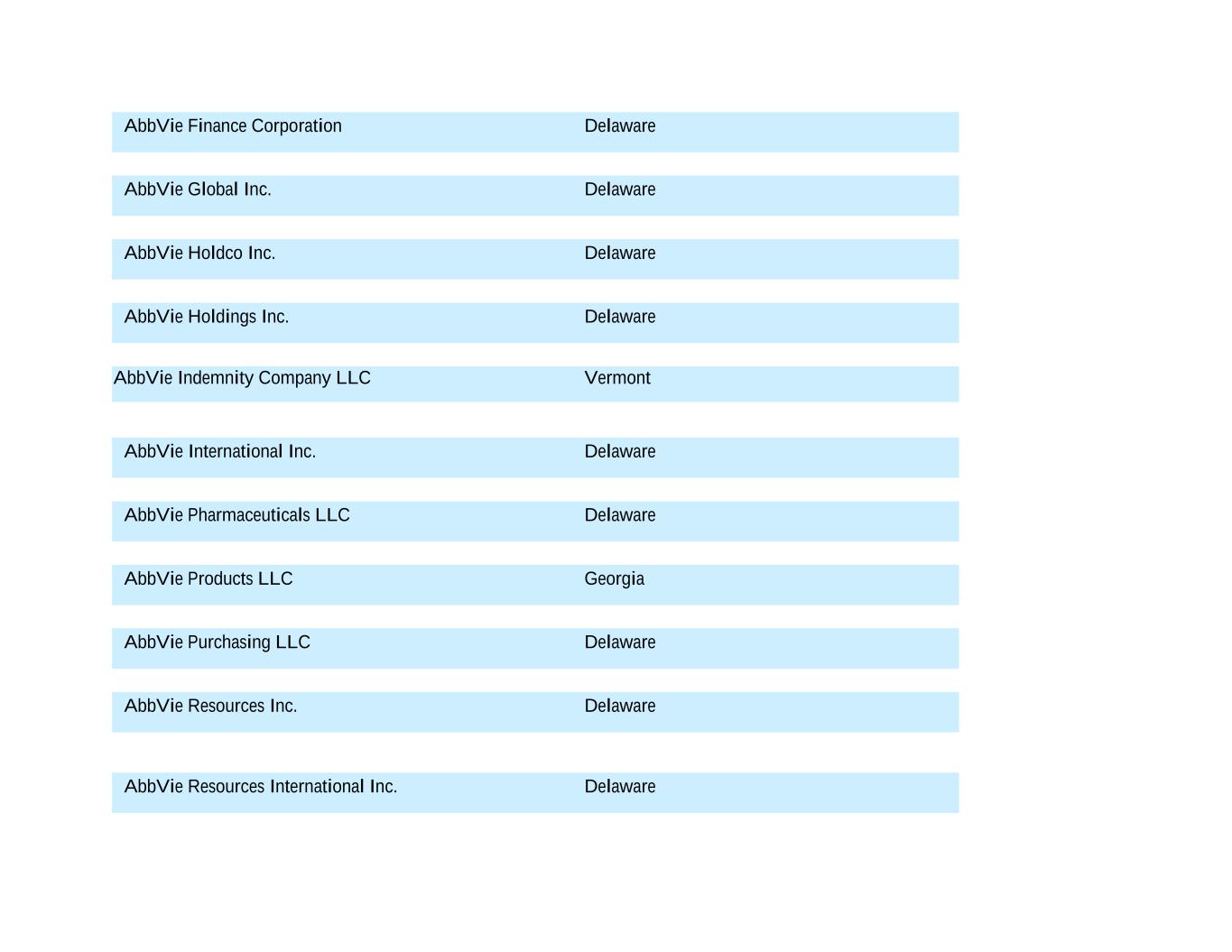 AbbVie Finance Corporation Delaware AbbVie Global Inc. Delaware AbbVie Holdco Inc. Delaware AbbVie Holdings Inc. Delaware AbbVie Indemnity Company LLC Vermont AbbVie International Inc. Delaware AbbVie Pharmaceuticals LLC Delaware AbbVie Products LLC Georgia AbbVie Purchasing LLC Delaware AbbVie Resources Inc. Delaware AbbVie Resources International Inc. Delaware