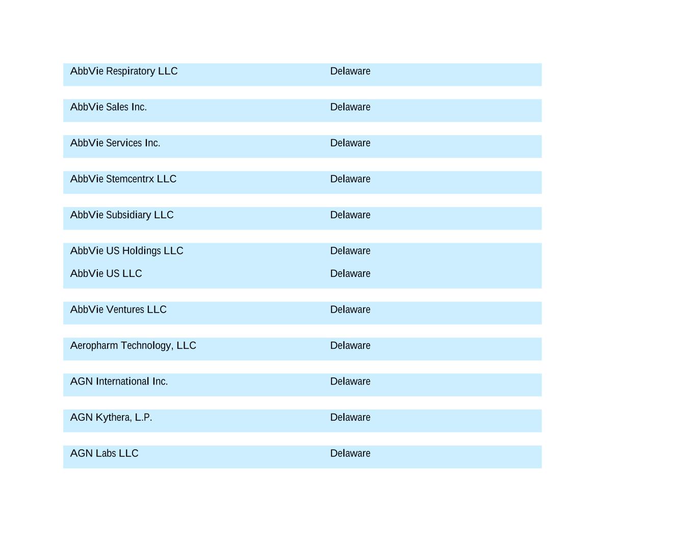 AbbVie Respiratory LLC Delaware AbbVie Sales Inc. Delaware AbbVie Services Inc. Delaware AbbVie Stemcentrx LLC Delaware AbbVie Subsidiary LLC Delaware AbbVie US Holdings LLC Delaware AbbVie US LLC Delaware AbbVie Ventures LLC Delaware Aeropharm Technology, LLC Delaware AGN International Inc. Delaware AGN Kythera, L.P. Delaware AGN Labs LLC Delaware