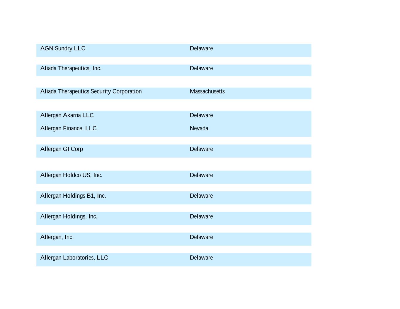 AGN Sundry LLC Delaware Aliada Therapeutics, Inc. Delaware Aliada Therapeutics Security Corporation Massachusetts Allergan Akarna LLC Delaware Allergan Finance, LLC Nevada Allergan GI Corp Delaware Allergan Holdco US, Inc. Delaware Allergan Holdings B1, Inc. Delaware Allergan Holdings, Inc. Delaware Allergan, Inc. Delaware Allergan Laboratories, LLC Delaware