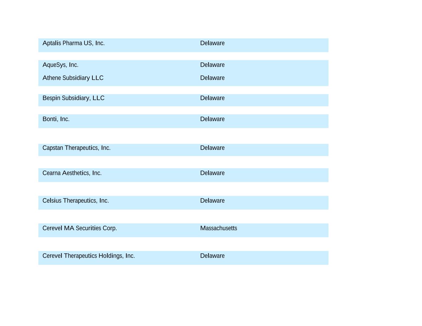 Aptalis Pharma US, Inc. Delaware AqueSys, Inc. Delaware Athene Subsidiary LLC Delaware Bespin Subsidiary, LLC Delaware Bonti, Inc. Delaware Capstan Therapeutics, Inc. Delaware Cearna Aesthetics, Inc. Delaware Celsius Therapeutics, Inc. Delaware Cerevel MA Securities Corp. Massachusetts Cerevel Therapeutics Holdings, Inc. Delaware