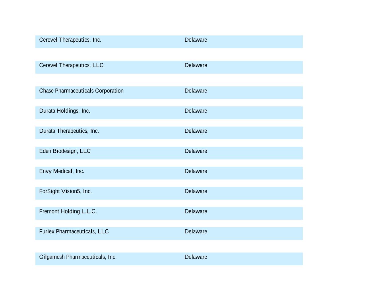 Cerevel Therapeutics, Inc. Delaware Cerevel Therapeutics, LLC Delaware Chase Pharmaceuticals Corporation Delaware Durata Holdings, Inc. Delaware Durata Therapeutics, Inc. Delaware Eden Biodesign, LLC Delaware Envy Medical, Inc. Delaware ForSight Vision5, Inc. Delaware Fremont Holding L.L.C. Delaware Furiex Pharmaceuticals, LLC Delaware Gilgamesh Pharmaceuticals, Inc. Delaware
