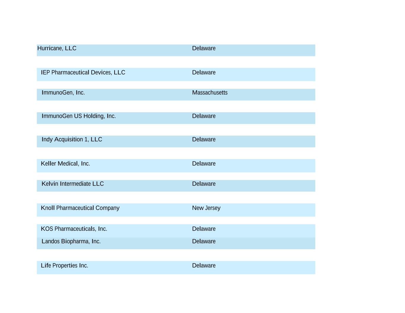 Hurricane, LLC Delaware IEP Pharmaceutical Devices, LLC Delaware ImmunoGen, Inc. Massachusetts ImmunoGen US Holding, Inc. Delaware Indy Acquisition 1, LLC Delaware Keller Medical, Inc. Delaware Kelvin Intermediate LLC Delaware Knoll Pharmaceutical Company New Jersey KOS Pharmaceuticals, Inc. Delaware Landos Biopharma, Inc. Delaware Life Properties Inc. Delaware