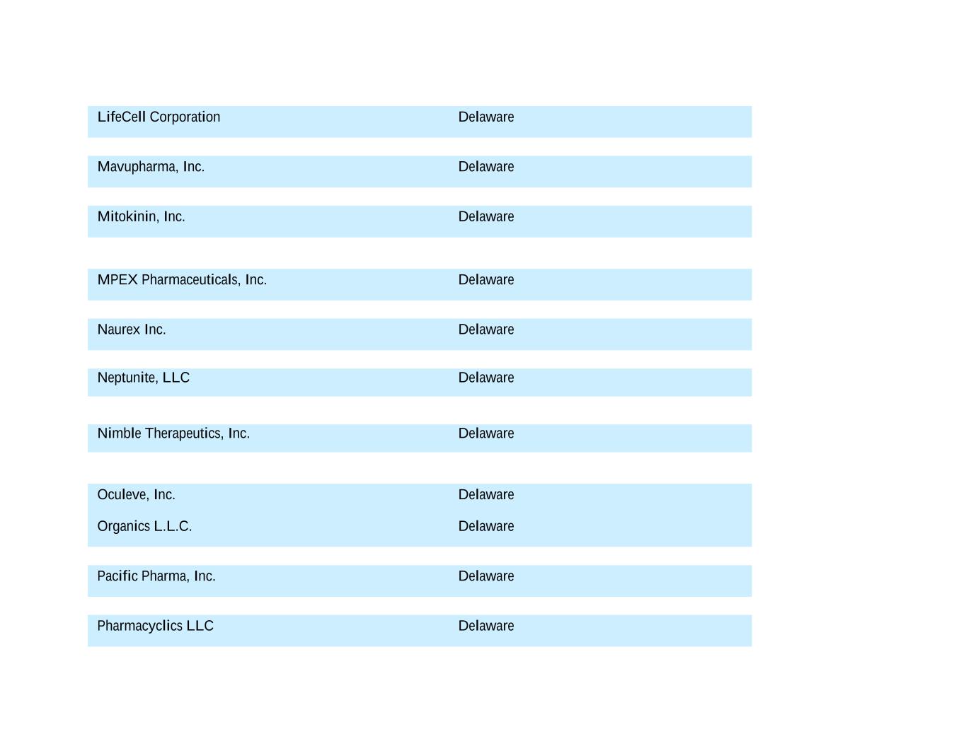 LifeCell Corporation Delaware Mavupharma, Inc. Delaware Mitokinin, Inc. Delaware MPEX Pharmaceuticals, Inc. Delaware Naurex Inc. Delaware Neptunite, LLC Delaware Nimble Therapeutics, Inc. Delaware Oculeve, Inc. Delaware Organics L.L.C. Delaware Pacific Pharma, Inc. Delaware Pharmacyclics LLC Delaware