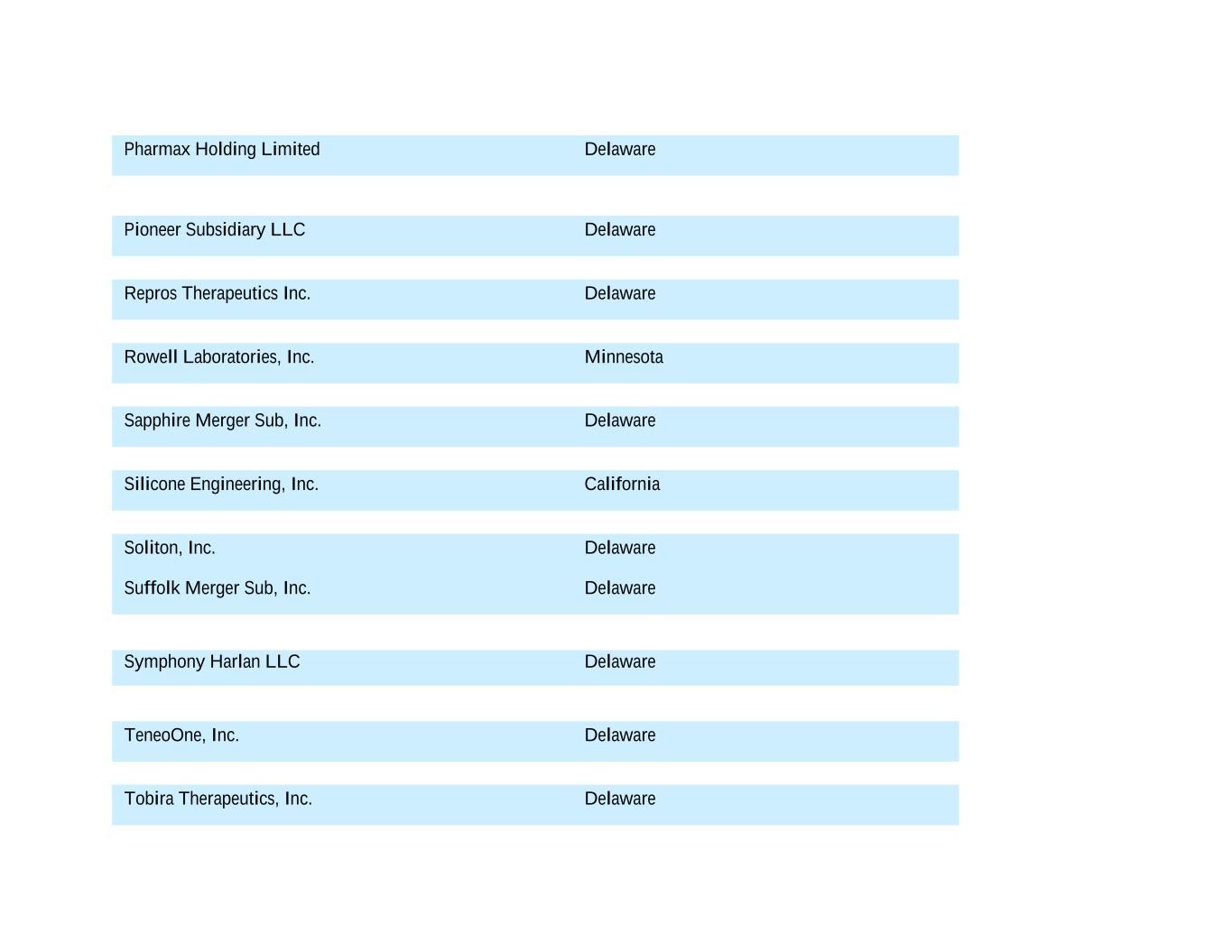 Pharmax Holding Limited Delaware Pioneer Subsidiary LLC Delaware Repros Therapeutics Inc. Delaware Rowell Laboratories, Inc. Minnesota Sapphire Merger Sub, Inc. Delaware Silicone Engineering, Inc. California Soliton, Inc. Delaware Suffolk Merger Sub, Inc. Delaware Symphony Harlan LLC Delaware TeneoOne, Inc. Delaware Tobira Therapeutics, Inc. Delaware