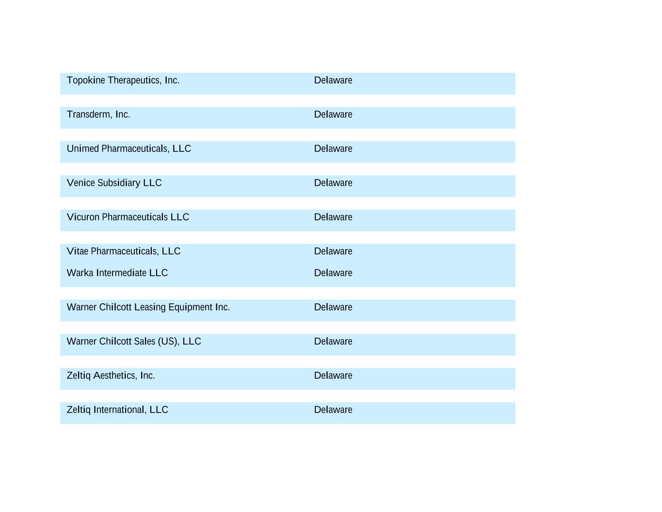 Topokine Therapeutics, Inc. Delaware Transderm, Inc. Delaware Unimed Pharmaceuticals, LLC Delaware Venice Subsidiary LLC Delaware Vicuron Pharmaceuticals LLC Delaware Vitae Pharmaceuticals, LLC Delaware Warka Intermediate LLC Delaware Warner Chilcott Leasing Equipment Inc. Delaware Warner Chilcott Sales (US), LLC Delaware Zeltiq Aesthetics, Inc. Delaware Zeltiq International, LLC Delaware
