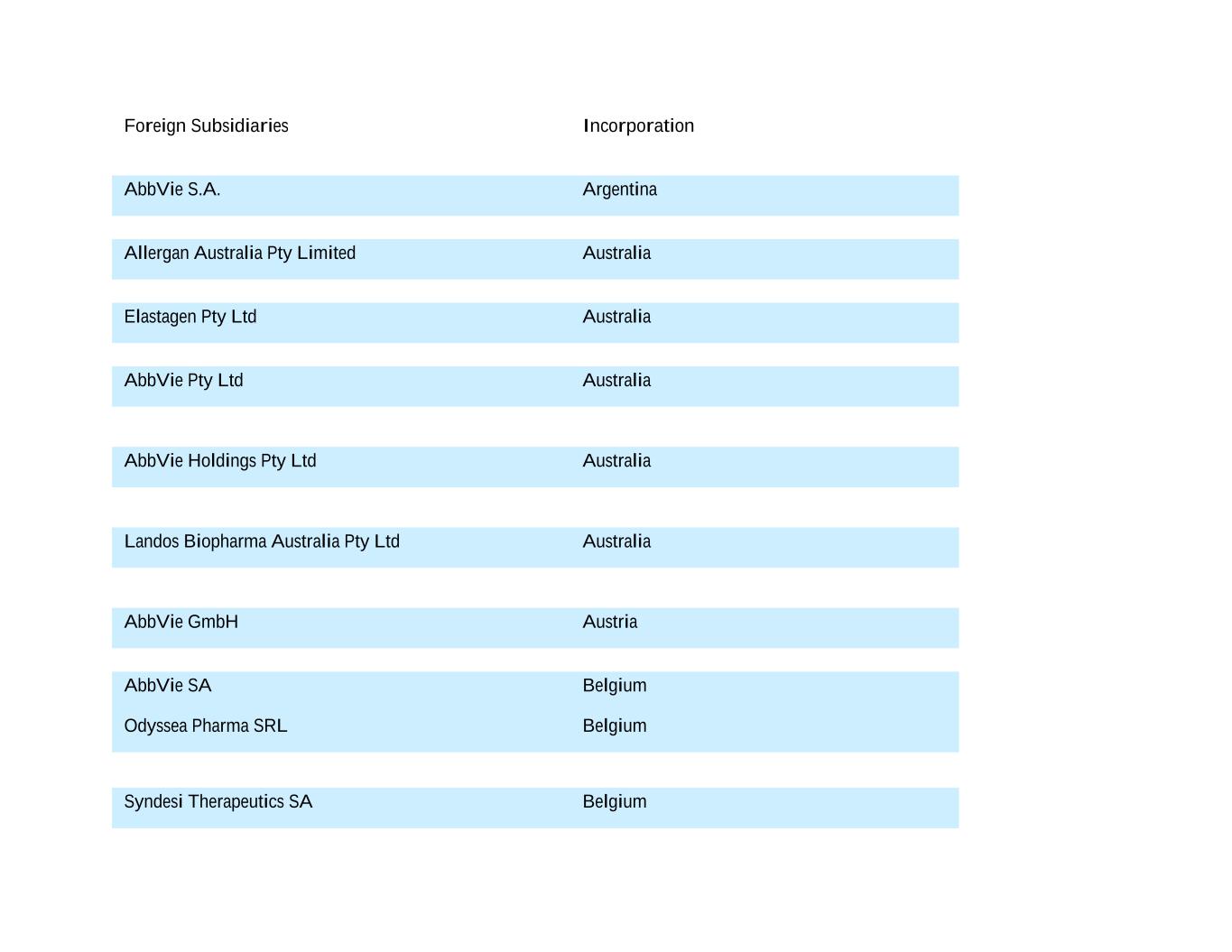 Foreign Subsidiaries Incorporation AbbVie S.A. Argentina Allergan Australia Pty Limited Australia Elastagen Pty Ltd Australia AbbVie Pty Ltd Australia AbbVie Holdings Pty Ltd Australia Landos Biopharma Australia Pty Ltd Australia AbbVie GmbH Austria AbbVie SA Belgium Odyssea Pharma SRL Belgium Syndesi Therapeutics SA Belgium