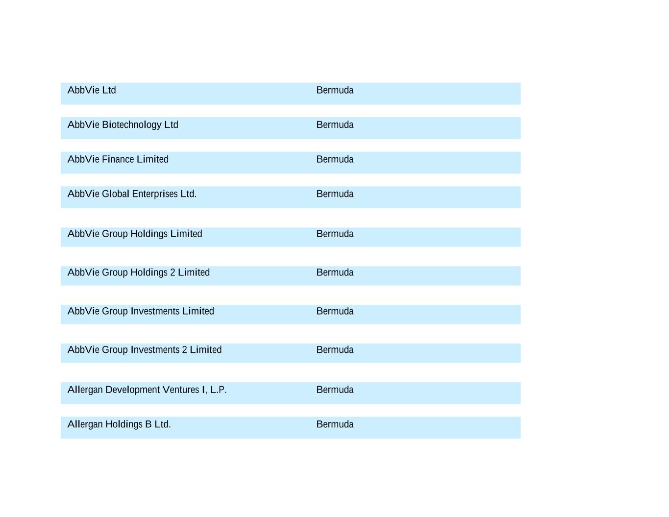 AbbVie Ltd Bermuda AbbVie Biotechnology Ltd Bermuda AbbVie Finance Limited Bermuda AbbVie Global Enterprises Ltd. Bermuda AbbVie Group Holdings Limited Bermuda AbbVie Group Holdings 2 Limited Bermuda AbbVie Group Investments Limited Bermuda AbbVie Group Investments 2 Limited Bermuda Allergan Development Ventures I, L.P. Bermuda Allergan Holdings B Ltd. Bermuda