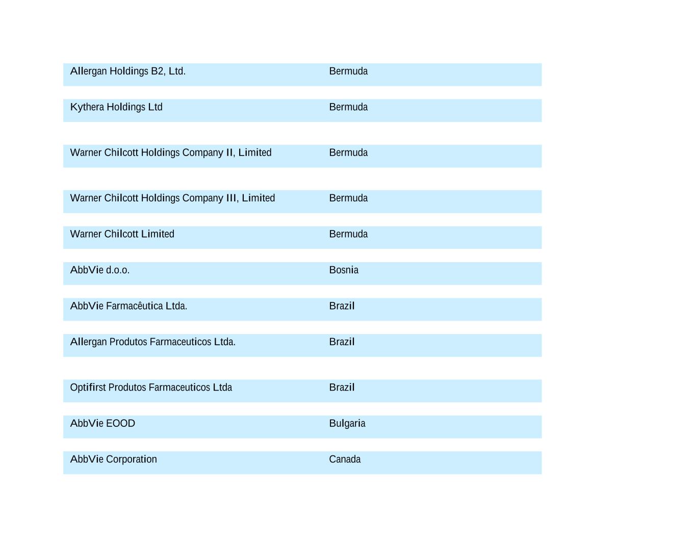 Allergan Holdings B2, Ltd. Bermuda Kythera Holdings Ltd Bermuda Warner Chilcott Holdings Company II, Limited Bermuda Warner Chilcott Holdings Company III, Limited Bermuda Warner Chilcott Limited Bermuda AbbVie d.o.o. Bosnia AbbVie Farmacêutica Ltda. Brazil Allergan Produtos Farmaceuticos Ltda. Brazil Optifirst Produtos Farmaceuticos Ltda Brazil AbbVie EOOD Bulgaria AbbVie Corporation Canada