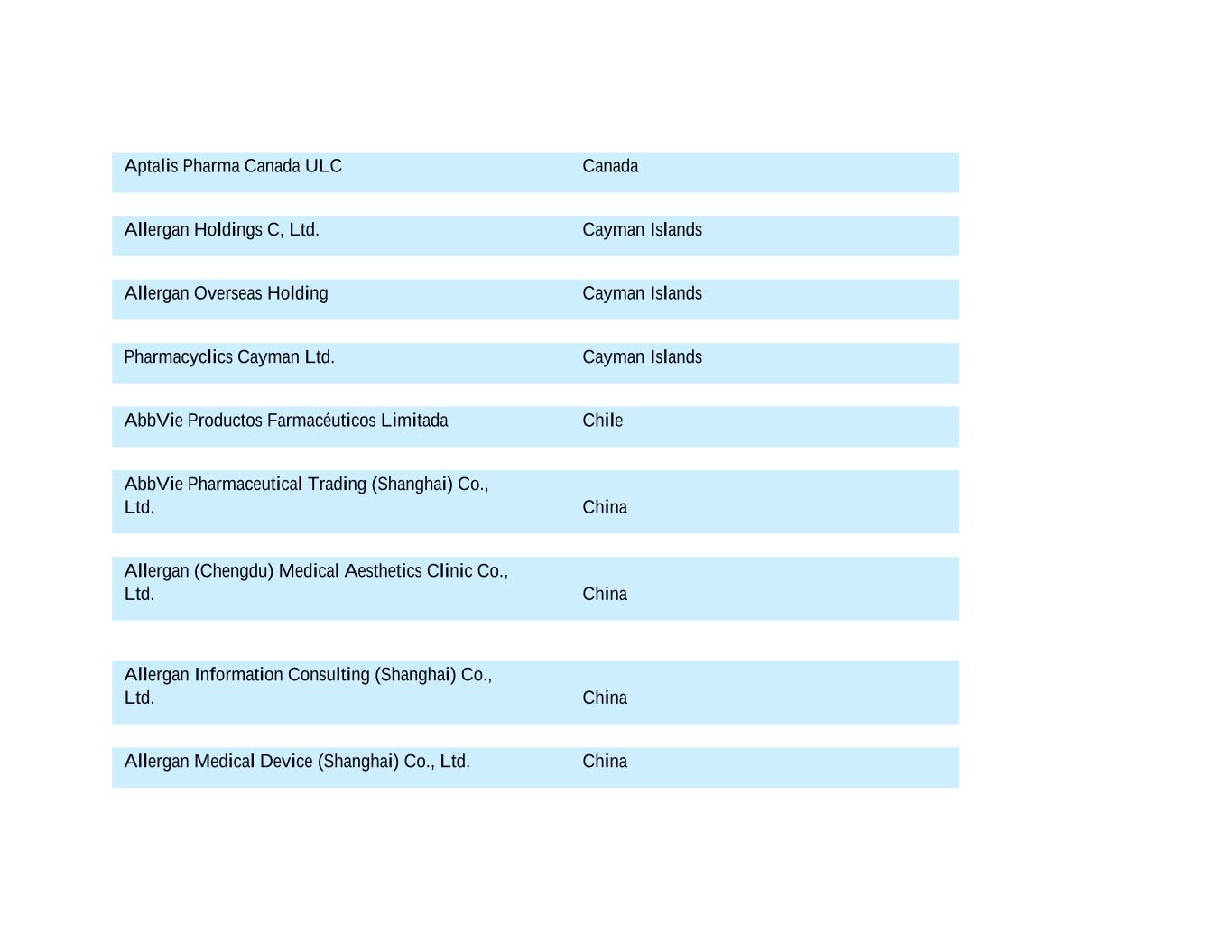 Aptalis Pharma Canada ULC Canada Allergan Holdings C, Ltd. Cayman Islands Allergan Overseas Holding Cayman Islands Pharmacyclics Cayman Ltd. Cayman Islands AbbVie Productos Farmacéuticos Limitada Chile AbbVie Pharmaceutical Trading (Shanghai) Co., Ltd. China Allergan (Chengdu) Medical Aesthetics Clinic Co., Ltd. China Allergan Information Consulting (Shanghai) Co., Ltd. China Allergan Medical Device (Shanghai) Co., Ltd. China