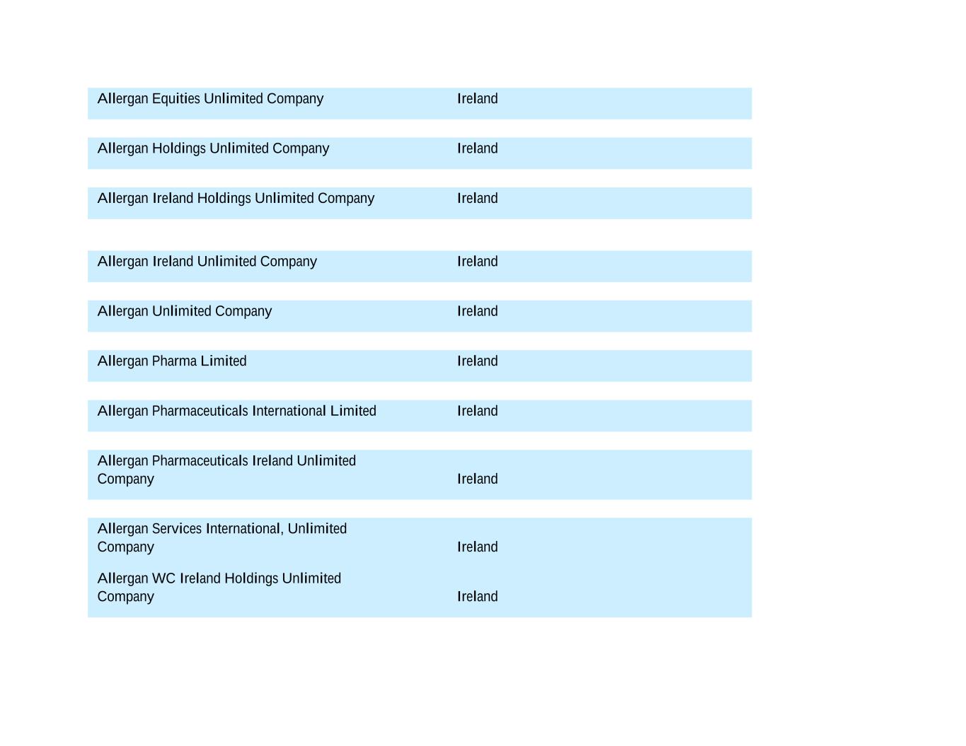 Allergan Equities Unlimited Company Ireland Allergan Holdings Unlimited Company Ireland Allergan Ireland Holdings Unlimited Company Ireland Allergan Ireland Unlimited Company Ireland Allergan Unlimited Company Ireland Allergan Pharma Limited Ireland Allergan Pharmaceuticals International Limited Ireland Allergan Pharmaceuticals Ireland Unlimited Company Ireland Allergan Services International, Unlimited Company Ireland Allergan WC Ireland Holdings Unlimited Company Ireland