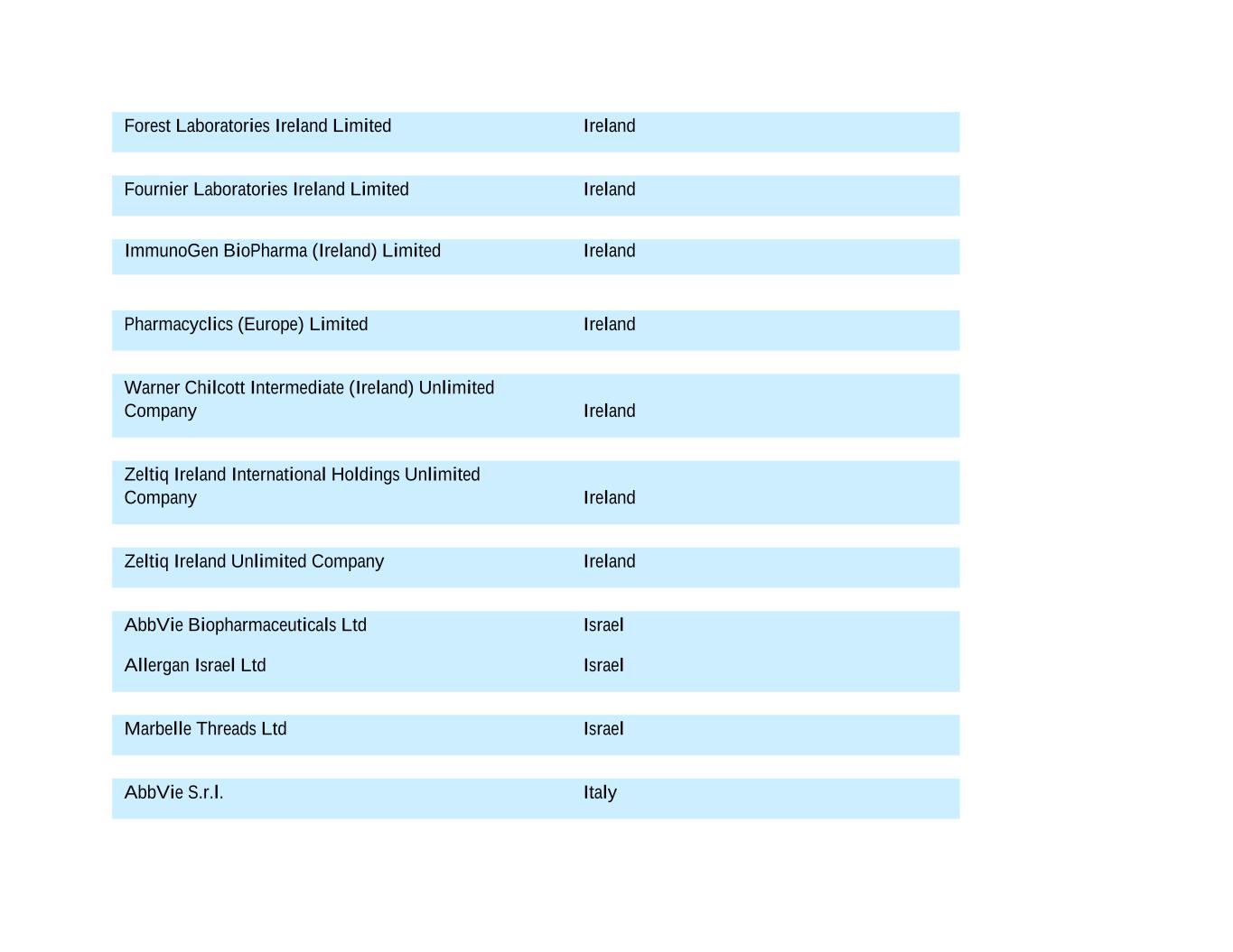Forest Laboratories Ireland Limited Ireland Fournier Laboratories Ireland Limited Ireland ImmunoGen BioPharma (Ireland) Limited Ireland Pharmacyclics (Europe) Limited Ireland Warner Chilcott Intermediate (Ireland) Unlimited Company Ireland Zeltiq Ireland International Holdings Unlimited Company Ireland Zeltiq Ireland Unlimited Company Ireland AbbVie Biopharmaceuticals Ltd Israel Allergan Israel Ltd Israel Marbelle Threads Ltd Israel AbbVie S.r.l. Italy