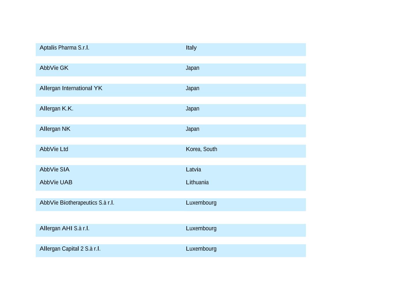 Aptalis Pharma S.r.l. Italy AbbVie GK Japan Allergan International YK Japan Allergan K.K. Japan Allergan NK Japan AbbVie Ltd Korea, South AbbVie SIA Latvia AbbVie UAB Lithuania AbbVie Biotherapeutics S.à r.l. Luxembourg Allergan AHI S.à r.l. Luxembourg Allergan Capital 2 S.à r.l. Luxembourg