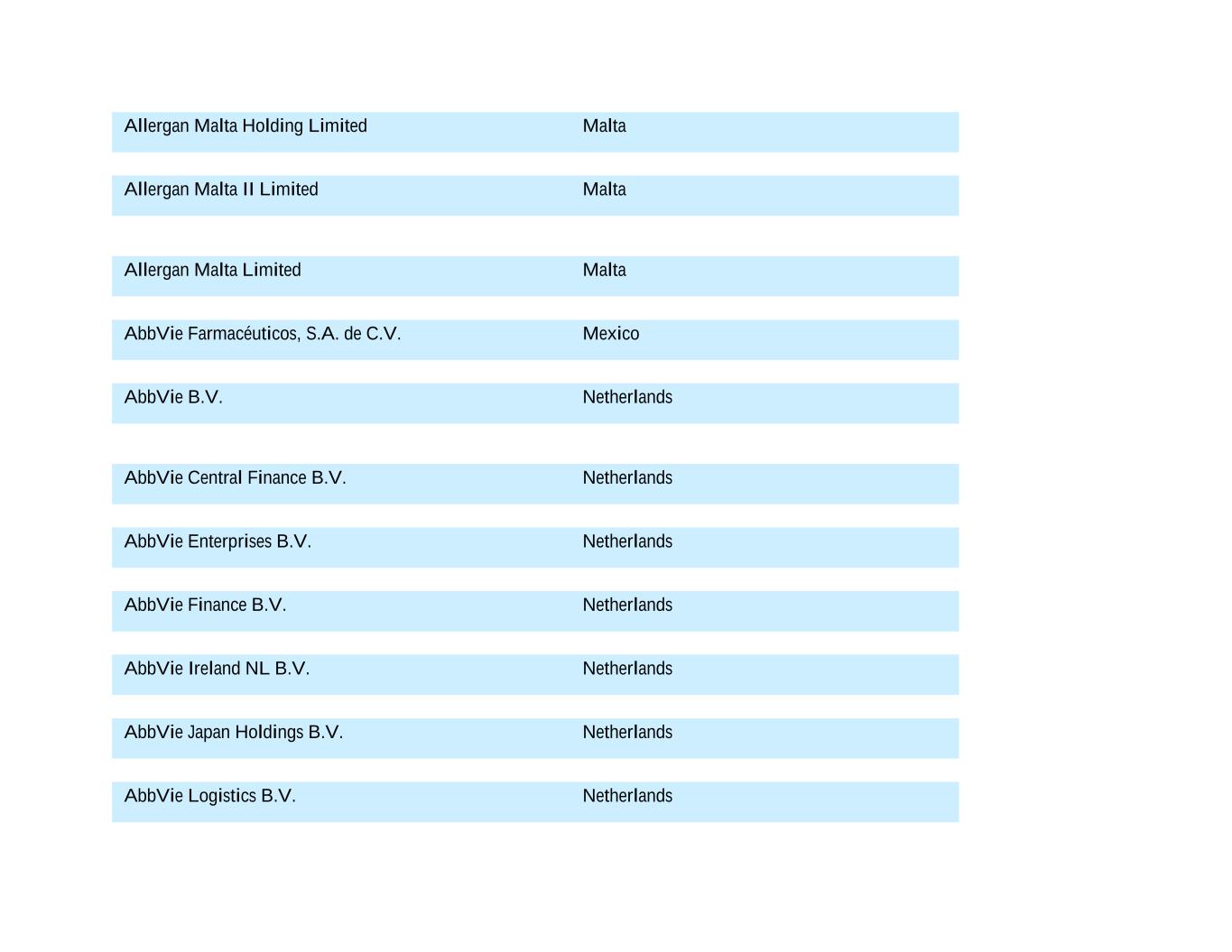 Allergan Malta Holding Limited Malta Allergan Malta II Limited Malta Allergan Malta Limited Malta AbbVie Farmacéuticos, S.A. de C.V. Mexico AbbVie B.V. Netherlands AbbVie Central Finance B.V. Netherlands AbbVie Enterprises B.V. Netherlands AbbVie Finance B.V. Netherlands AbbVie Ireland NL B.V. Netherlands AbbVie Japan Holdings B.V. Netherlands AbbVie Logistics B.V. Netherlands