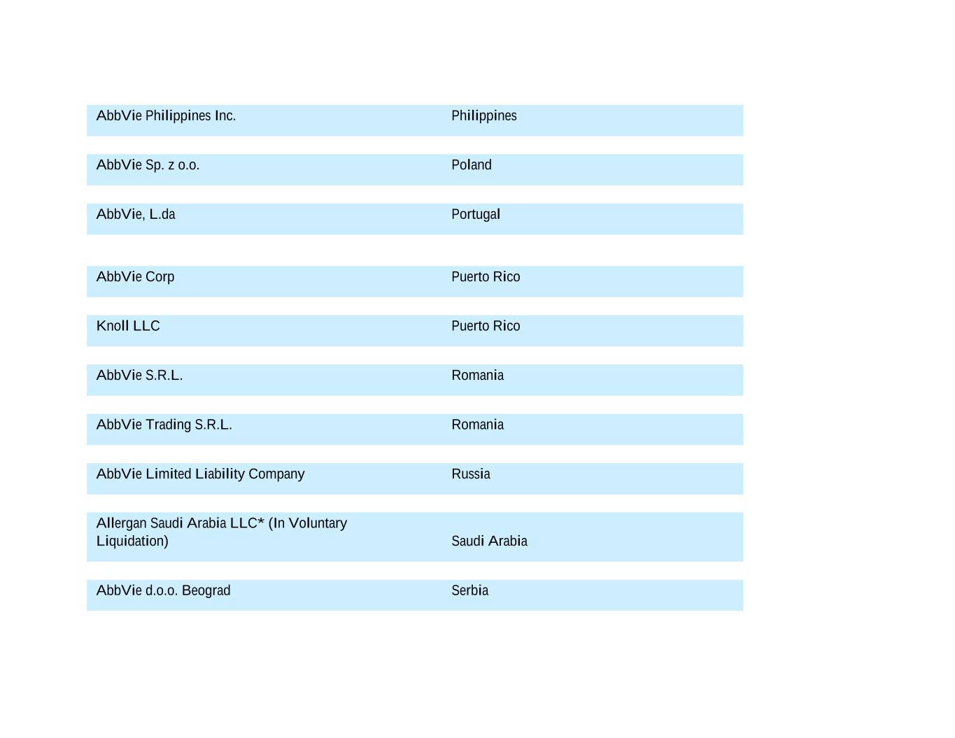 AbbVie Philippines Inc. Philippines AbbVie Sp. z o.o. Poland AbbVie, L.da Portugal AbbVie Corp Puerto Rico Knoll LLC Puerto Rico AbbVie S.R.L. Romania AbbVie Trading S.R.L. Romania AbbVie Limited Liability Company Russia Allergan Saudi Arabia LLC* (In Voluntary Liquidation) Saudi Arabia AbbVie d.o.o. Beograd Serbia