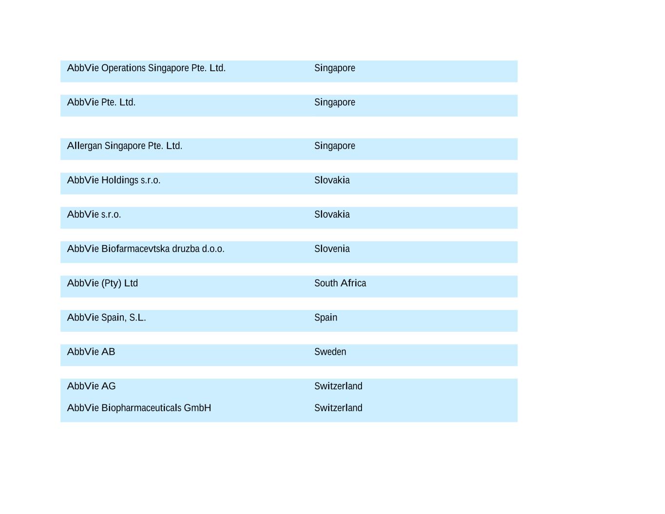 AbbVie Operations Singapore Pte. Ltd. Singapore AbbVie Pte. Ltd. Singapore Allergan Singapore Pte. Ltd. Singapore AbbVie Holdings s.r.o. Slovakia AbbVie s.r.o. Slovakia AbbVie Biofarmacevtska druzba d.o.o. Slovenia AbbVie (Pty) Ltd South Africa AbbVie Spain, S.L. Spain AbbVie AB Sweden AbbVie AG Switzerland AbbVie Biopharmaceuticals GmbH Switzerland