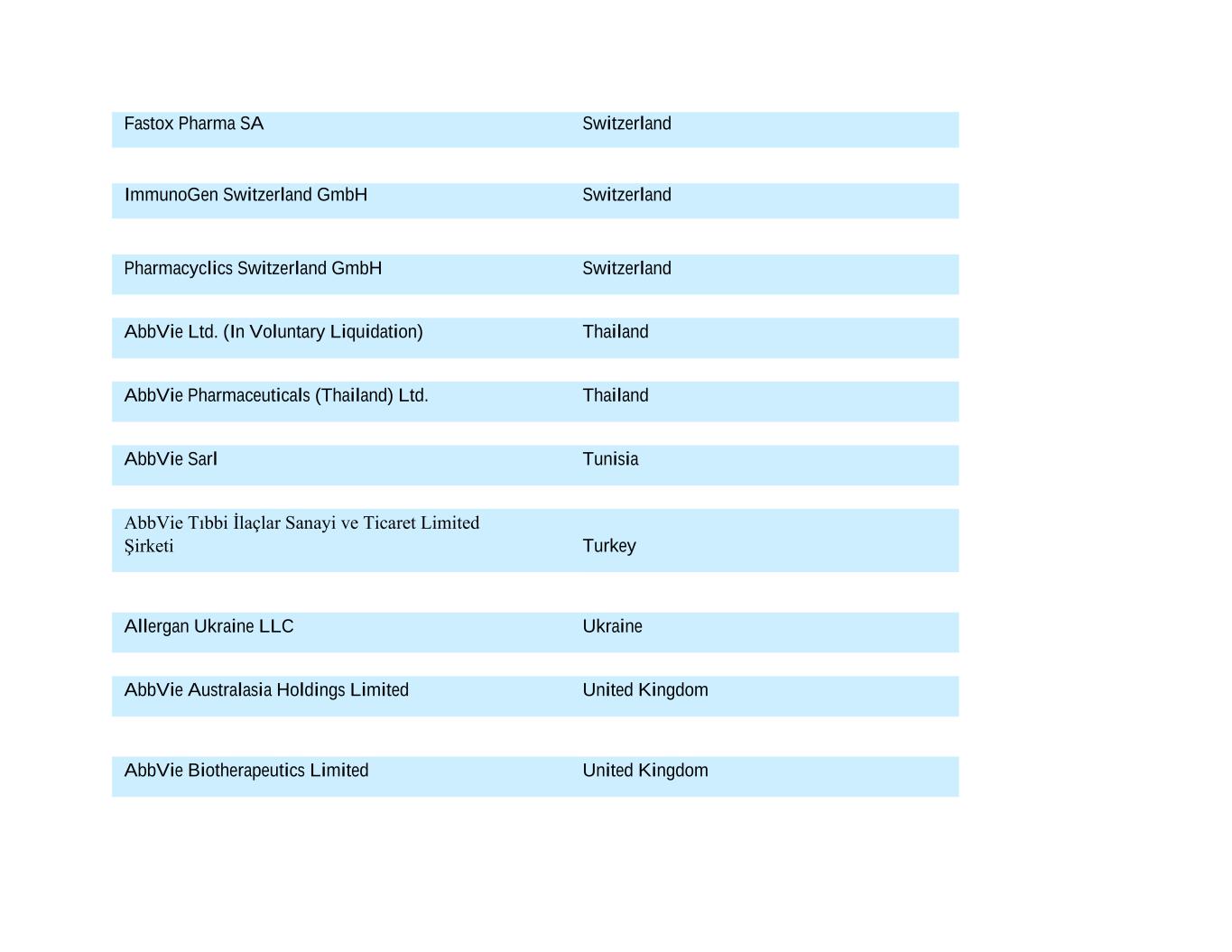 Fastox Pharma SA Switzerland ImmunoGen Switzerland GmbH Switzerland Pharmacyclics Switzerland GmbH Switzerland AbbVie Ltd. (In Voluntary Liquidation) Thailand AbbVie Pharmaceuticals (Thailand) Ltd. Thailand AbbVie Sarl Tunisia AbbVie Tıbbi İlaçlar Sanayi ve Ticaret Limited Şirketi Turkey Allergan Ukraine LLC Ukraine AbbVie Australasia Holdings Limited United Kingdom AbbVie Biotherapeutics Limited United Kingdom
