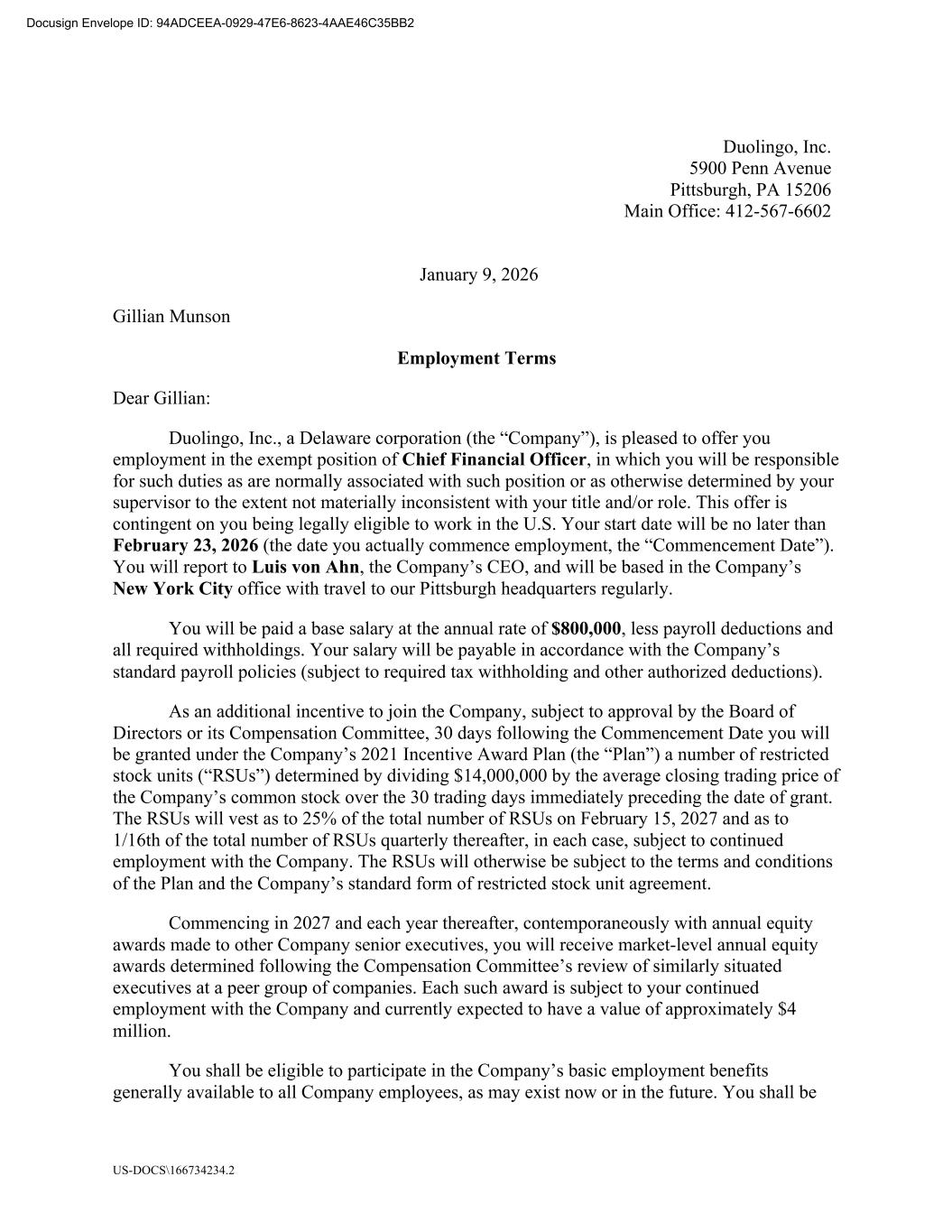 US-DOCS\166734234.2 Duolingo, Inc. 5900 Penn Avenue Pittsburgh, PA 15206 Main Office: 412-567-6602 January 9, 2026 Gillian Munson Employment Terms Dear Gillian: Duolingo, Inc., a Delaware corporation (the “Company”), is pleased to offer you employment in the exempt position of Chief Financial Officer, in which you will be responsible for such duties as are normally associated with such position or as otherwise determined by your supervisor to the extent not materially inconsistent with your title and/or role. This offer is contingent on you being legally eligible to work in the U.S. Your start date will be no later than February 23, 2026 (the date you actually commence employment, the “Commencement Date”). You will report to Luis von Ahn, the Company’s CEO, and will be based in the Company’s New York City office with travel to our Pittsburgh headquarters regularly. You will be paid a base salary at the annual rate of $800,000, less payroll deductions and all required withholdings. Your salary will be payable in accordance with the Company’s standard payroll policies (subject to required tax withholding and other authorized deductions). As an additional incentive to join the Company, subject to approval by the Board of Directors or its Compensation Committee, 30 days following the Commencement Date you will be granted under the Company’s 2021 Incentive Award Plan (the “Plan”) a number of restricted stock units (“RSUs”) determined by dividing $14,000,000 by the average closing trading price of the Company’s common stock over the 30 trading days immediately preceding the date of grant. The RSUs will vest as to 25% of the total number of RSUs on February 15, 2027 and as to 1/16th of the total number of RSUs quarterly thereafter, in each case, subject to continued employment with the Company. The RSUs will otherwise be subject to the terms and conditions of the Plan and the Company’s standard form of restricted stock unit agreement. Commencing in 2027 and each year thereafter, contemporaneously with annual equity awards made to other Company senior executives, you will receive market-level annual equity awards determined following the Compensation Committee’s review of similarly situated executives at a peer group of companies. Each such award is subject to your continued employment with the Company and currently expected to have a value of approximately $4 million. You shall be eligible to participate in the Company’s basic employment benefits generally available to all Company employees, as may exist now or in the future. You shall be Docusign Envelope ID: 94ADCEEA-0929-47E6-8623-4AAE46C35BB2