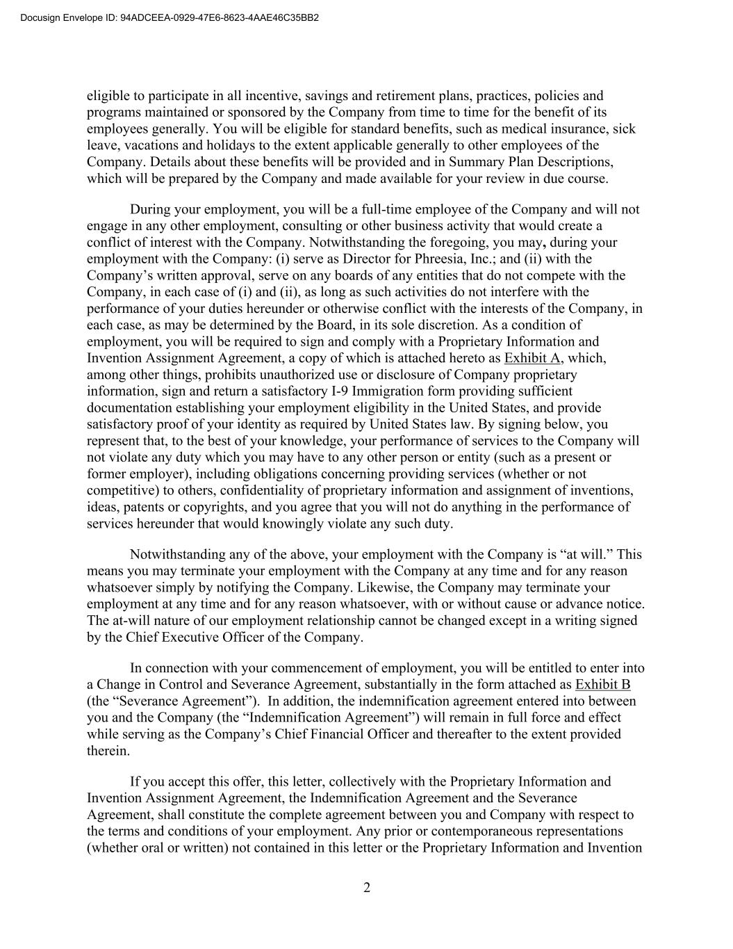 2 eligible to participate in all incentive, savings and retirement plans, practices, policies and programs maintained or sponsored by the Company from time to time for the benefit of its employees generally. You will be eligible for standard benefits, such as medical insurance, sick leave, vacations and holidays to the extent applicable generally to other employees of the Company. Details about these benefits will be provided and in Summary Plan Descriptions, which will be prepared by the Company and made available for your review in due course. During your employment, you will be a full-time employee of the Company and will not engage in any other employment, consulting or other business activity that would create a conflict of interest with the Company. Notwithstanding the foregoing, you may, during your employment with the Company: (i) serve as Director for Phreesia, Inc.; and (ii) with the Company’s written approval, serve on any boards of any entities that do not compete with the Company, in each case of (i) and (ii), as long as such activities do not interfere with the performance of your duties hereunder or otherwise conflict with the interests of the Company, in each case, as may be determined by the Board, in its sole discretion. As a condition of employment, you will be required to sign and comply with a Proprietary Information and Invention Assignment Agreement, a copy of which is attached hereto as Exhibit A, which, among other things, prohibits unauthorized use or disclosure of Company proprietary information, sign and return a satisfactory I-9 Immigration form providing sufficient documentation establishing your employment eligibility in the United States, and provide satisfactory proof of your identity as required by United States law. By signing below, you represent that, to the best of your knowledge, your performance of services to the Company will not violate any duty which you may have to any other person or entity (such as a present or former employer), including obligations concerning providing services (whether or not competitive) to others, confidentiality of proprietary information and assignment of inventions, ideas, patents or copyrights, and you agree that you will not do anything in the performance of services hereunder that would knowingly violate any such duty. Notwithstanding any of the above, your employment with the Company is “at will.” This means you may terminate your employment with the Company at any time and for any reason whatsoever simply by notifying the Company. Likewise, the Company may terminate your employment at any time and for any reason whatsoever, with or without cause or advance notice. The at-will nature of our employment relationship cannot be changed except in a writing signed by the Chief Executive Officer of the Company. In connection with your commencement of employment, you will be entitled to enter into a Change in Control and Severance Agreement, substantially in the form attached as Exhibit B (the “Severance Agreement”). In addition, the indemnification agreement entered into between you and the Company (the “Indemnification Agreement”) will remain in full force and effect while serving as the Company’s Chief Financial Officer and thereafter to the extent provided therein. If you accept this offer, this letter, collectively with the Proprietary Information and Invention Assignment Agreement, the Indemnification Agreement and the Severance Agreement, shall constitute the complete agreement between you and Company with respect to the terms and conditions of your employment. Any prior or contemporaneous representations (whether oral or written) not contained in this letter or the Proprietary Information and Invention Docusign Envelope ID: 94ADCEEA-0929-47E6-8623-4AAE46C35BB2