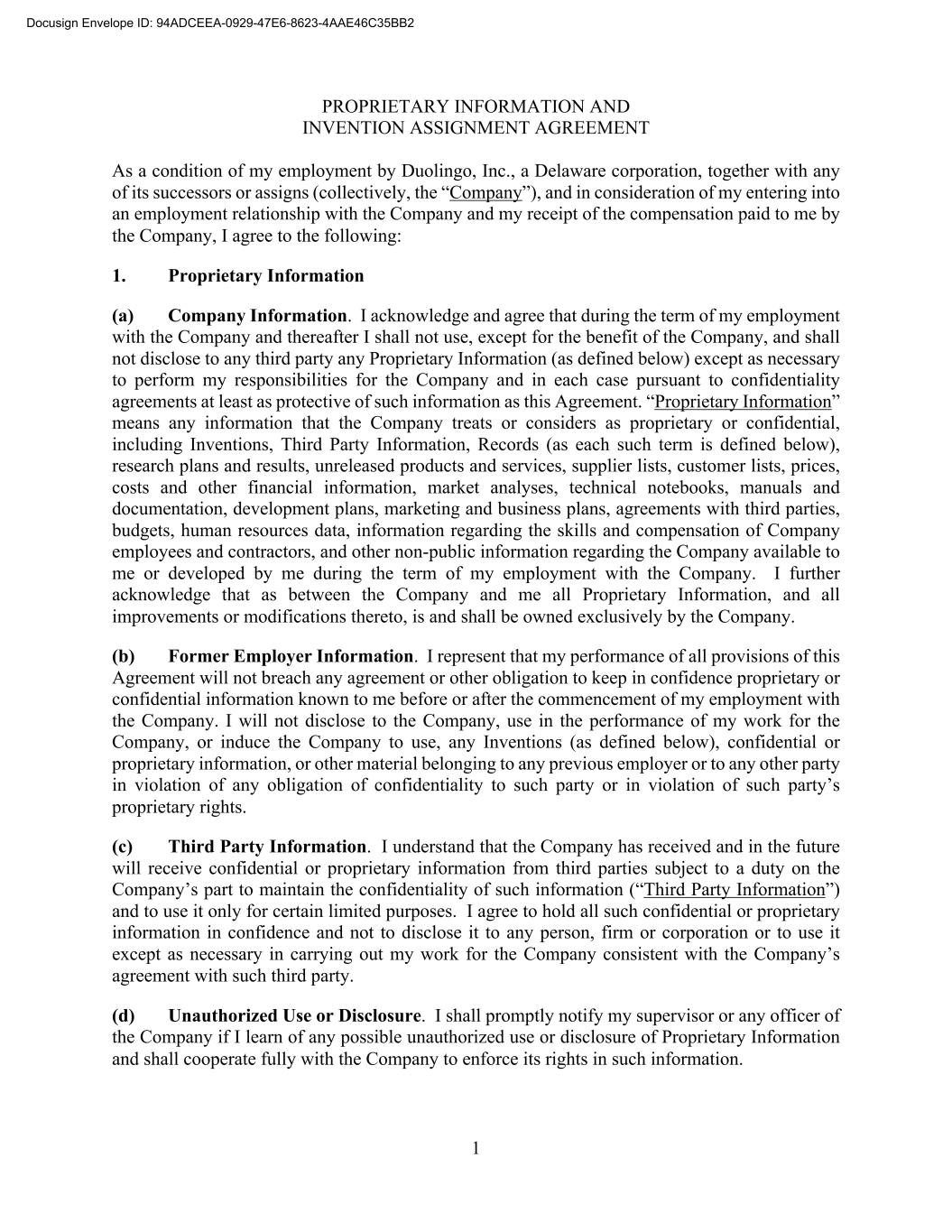 1 PROPRIETARY INFORMATION AND INVENTION ASSIGNMENT AGREEMENT As a condition of my employment by Duolingo, Inc., a Delaware corporation, together with any of its successors or assigns (collectively, the “Company”), and in consideration of my entering into an employment relationship with the Company and my receipt of the compensation paid to me by the Company, I agree to the following: 1. Proprietary Information (a) Company Information. I acknowledge and agree that during the term of my employment with the Company and thereafter I shall not use, except for the benefit of the Company, and shall not disclose to any third party any Proprietary Information (as defined below) except as necessary to perform my responsibilities for the Company and in each case pursuant to confidentiality agreements at least as protective of such information as this Agreement. “Proprietary Information” means any information that the Company treats or considers as proprietary or confidential, including Inventions, Third Party Information, Records (as each such term is defined below), research plans and results, unreleased products and services, supplier lists, customer lists, prices, costs and other financial information, market analyses, technical notebooks, manuals and documentation, development plans, marketing and business plans, agreements with third parties, budgets, human resources data, information regarding the skills and compensation of Company employees and contractors, and other non-public information regarding the Company available to me or developed by me during the term of my employment with the Company. I further acknowledge that as between the Company and me all Proprietary Information, and all improvements or modifications thereto, is and shall be owned exclusively by the Company. (b) Former Employer Information. I represent that my performance of all provisions of this Agreement will not breach any agreement or other obligation to keep in confidence proprietary or confidential information known to me before or after the commencement of my employment with the Company. I will not disclose to the Company, use in the performance of my work for the Company, or induce the Company to use, any Inventions (as defined below), confidential or proprietary information, or other material belonging to any previous employer or to any other party in violation of any obligation of confidentiality to such party or in violation of such party’s proprietary rights. (c) Third Party Information. I understand that the Company has received and in the future will receive confidential or proprietary information from third parties subject to a duty on the Company’s part to maintain the confidentiality of such information (“Third Party Information”) and to use it only for certain limited purposes. I agree to hold all such confidential or proprietary information in confidence and not to disclose it to any person, firm or corporation or to use it except as necessary in carrying out my work for the Company consistent with the Company’s agreement with such third party. (d) Unauthorized Use or Disclosure. I shall promptly notify my supervisor or any officer of the Company if I learn of any possible unauthorized use or disclosure of Proprietary Information and shall cooperate fully with the Company to enforce its rights in such information. Docusign Envelope ID: 94ADCEEA-0929-47E6-8623-4AAE46C35BB2