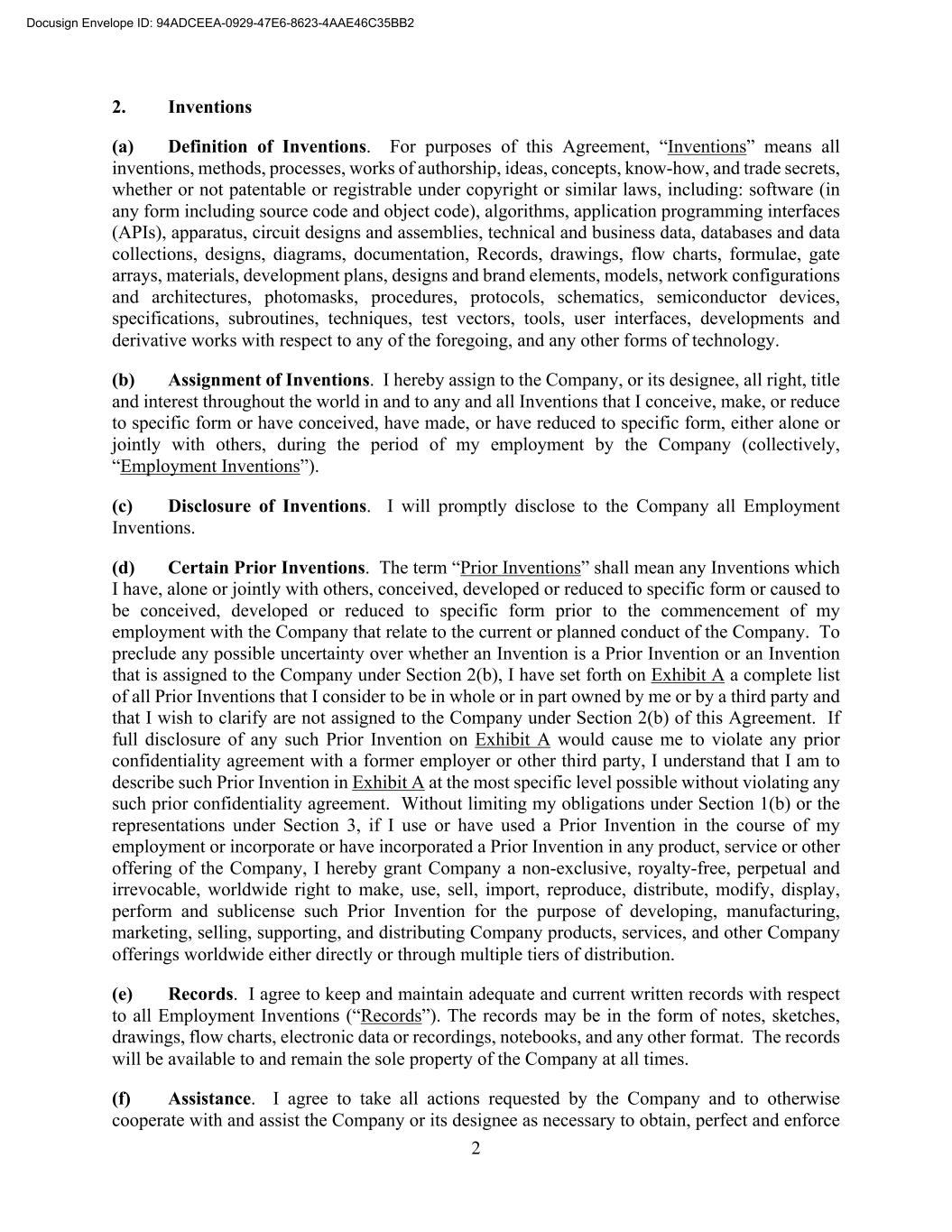 2 2. Inventions (a) Definition of Inventions. For purposes of this Agreement, “Inventions” means all inventions, methods, processes, works of authorship, ideas, concepts, know-how, and trade secrets, whether or not patentable or registrable under copyright or similar laws, including: software (in any form including source code and object code), algorithms, application programming interfaces (APIs), apparatus, circuit designs and assemblies, technical and business data, databases and data collections, designs, diagrams, documentation, Records, drawings, flow charts, formulae, gate arrays, materials, development plans, designs and brand elements, models, network configurations and architectures, photomasks, procedures, protocols, schematics, semiconductor devices, specifications, subroutines, techniques, test vectors, tools, user interfaces, developments and derivative works with respect to any of the foregoing, and any other forms of technology. (b) Assignment of Inventions. I hereby assign to the Company, or its designee, all right, title and interest throughout the world in and to any and all Inventions that I conceive, make, or reduce to specific form or have conceived, have made, or have reduced to specific form, either alone or jointly with others, during the period of my employment by the Company (collectively, “Employment Inventions”). (c) Disclosure of Inventions. I will promptly disclose to the Company all Employment Inventions. (d) Certain Prior Inventions. The term “Prior Inventions” shall mean any Inventions which I have, alone or jointly with others, conceived, developed or reduced to specific form or caused to be conceived, developed or reduced to specific form prior to the commencement of my employment with the Company that relate to the current or planned conduct of the Company. To preclude any possible uncertainty over whether an Invention is a Prior Invention or an Invention that is assigned to the Company under Section 2(b), I have set forth on Exhibit A a complete list of all Prior Inventions that I consider to be in whole or in part owned by me or by a third party and that I wish to clarify are not assigned to the Company under Section 2(b) of this Agreement. If full disclosure of any such Prior Invention on Exhibit A would cause me to violate any prior confidentiality agreement with a former employer or other third party, I understand that I am to describe such Prior Invention in Exhibit A at the most specific level possible without violating any such prior confidentiality agreement. Without limiting my obligations under Section 1(b) or the representations under Section 3, if I use or have used a Prior Invention in the course of my employment or incorporate or have incorporated a Prior Invention in any product, service or other offering of the Company, I hereby grant Company a non-exclusive, royalty-free, perpetual and irrevocable, worldwide right to make, use, sell, import, reproduce, distribute, modify, display, perform and sublicense such Prior Invention for the purpose of developing, manufacturing, marketing, selling, supporting, and distributing Company products, services, and other Company offerings worldwide either directly or through multiple tiers of distribution. (e) Records. I agree to keep and maintain adequate and current written records with respect to all Employment Inventions (“Records”). The records may be in the form of notes, sketches, drawings, flow charts, electronic data or recordings, notebooks, and any other format. The records will be available to and remain the sole property of the Company at all times. (f) Assistance. I agree to take all actions requested by the Company and to otherwise cooperate with and assist the Company or its designee as necessary to obtain, perfect and enforce Docusign Envelope ID: 94ADCEEA-0929-47E6-8623-4AAE46C35BB2