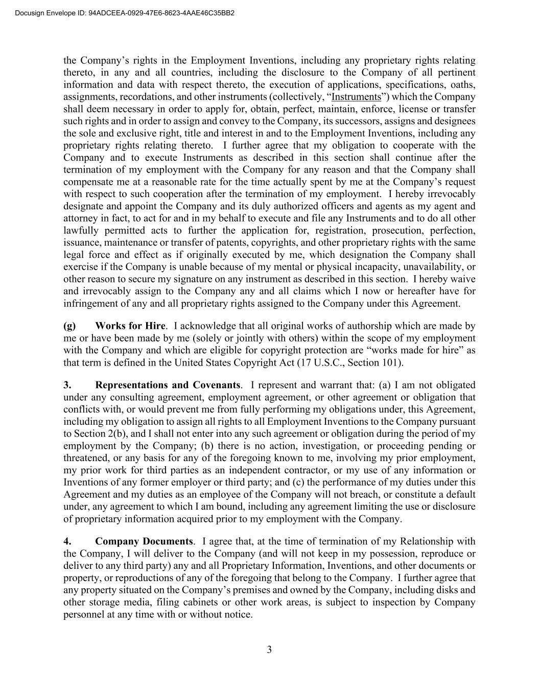 3 the Company’s rights in the Employment Inventions, including any proprietary rights relating thereto, in any and all countries, including the disclosure to the Company of all pertinent information and data with respect thereto, the execution of applications, specifications, oaths, assignments, recordations, and other instruments (collectively, “Instruments”) which the Company shall deem necessary in order to apply for, obtain, perfect, maintain, enforce, license or transfer such rights and in order to assign and convey to the Company, its successors, assigns and designees the sole and exclusive right, title and interest in and to the Employment Inventions, including any proprietary rights relating thereto. I further agree that my obligation to cooperate with the Company and to execute Instruments as described in this section shall continue after the termination of my employment with the Company for any reason and that the Company shall compensate me at a reasonable rate for the time actually spent by me at the Company’s request with respect to such cooperation after the termination of my employment. I hereby irrevocably designate and appoint the Company and its duly authorized officers and agents as my agent and attorney in fact, to act for and in my behalf to execute and file any Instruments and to do all other lawfully permitted acts to further the application for, registration, prosecution, perfection, issuance, maintenance or transfer of patents, copyrights, and other proprietary rights with the same legal force and effect as if originally executed by me, which designation the Company shall exercise if the Company is unable because of my mental or physical incapacity, unavailability, or other reason to secure my signature on any instrument as described in this section. I hereby waive and irrevocably assign to the Company any and all claims which I now or hereafter have for infringement of any and all proprietary rights assigned to the Company under this Agreement. (g) Works for Hire. I acknowledge that all original works of authorship which are made by me or have been made by me (solely or jointly with others) within the scope of my employment with the Company and which are eligible for copyright protection are “works made for hire” as that term is defined in the United States Copyright Act (17 U.S.C., Section 101). 3. Representations and Covenants. I represent and warrant that: (a) I am not obligated under any consulting agreement, employment agreement, or other agreement or obligation that conflicts with, or would prevent me from fully performing my obligations under, this Agreement, including my obligation to assign all rights to all Employment Inventions to the Company pursuant to Section 2(b), and I shall not enter into any such agreement or obligation during the period of my employment by the Company; (b) there is no action, investigation, or proceeding pending or threatened, or any basis for any of the foregoing known to me, involving my prior employment, my prior work for third parties as an independent contractor, or my use of any information or Inventions of any former employer or third party; and (c) the performance of my duties under this Agreement and my duties as an employee of the Company will not breach, or constitute a default under, any agreement to which I am bound, including any agreement limiting the use or disclosure of proprietary information acquired prior to my employment with the Company. 4. Company Documents. I agree that, at the time of termination of my Relationship with the Company, I will deliver to the Company (and will not keep in my possession, reproduce or deliver to any third party) any and all Proprietary Information, Inventions, and other documents or property, or reproductions of any of the foregoing that belong to the Company. I further agree that any property situated on the Company’s premises and owned by the Company, including disks and other storage media, filing cabinets or other work areas, is subject to inspection by Company personnel at any time with or without notice. Docusign Envelope ID: 94ADCEEA-0929-47E6-8623-4AAE46C35BB2