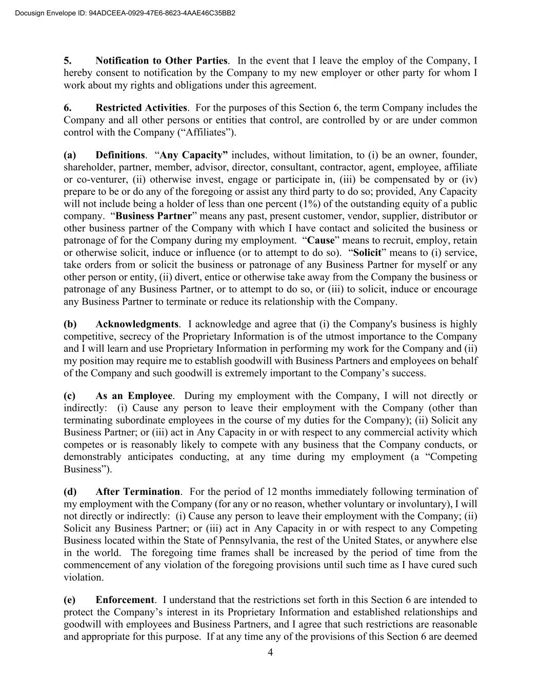 4 5. Notification to Other Parties. In the event that I leave the employ of the Company, I hereby consent to notification by the Company to my new employer or other party for whom I work about my rights and obligations under this agreement. 6. Restricted Activities. For the purposes of this Section 6, the term Company includes the Company and all other persons or entities that control, are controlled by or are under common control with the Company (“Affiliates”). (a) Definitions. “Any Capacity” includes, without limitation, to (i) be an owner, founder, shareholder, partner, member, advisor, director, consultant, contractor, agent, employee, affiliate or co-venturer, (ii) otherwise invest, engage or participate in, (iii) be compensated by or (iv) prepare to be or do any of the foregoing or assist any third party to do so; provided, Any Capacity will not include being a holder of less than one percent (1%) of the outstanding equity of a public company. “Business Partner” means any past, present customer, vendor, supplier, distributor or other business partner of the Company with which I have contact and solicited the business or patronage of for the Company during my employment. “Cause” means to recruit, employ, retain or otherwise solicit, induce or influence (or to attempt to do so). “Solicit” means to (i) service, take orders from or solicit the business or patronage of any Business Partner for myself or any other person or entity, (ii) divert, entice or otherwise take away from the Company the business or patronage of any Business Partner, or to attempt to do so, or (iii) to solicit, induce or encourage any Business Partner to terminate or reduce its relationship with the Company. (b) Acknowledgments. I acknowledge and agree that (i) the Company's business is highly competitive, secrecy of the Proprietary Information is of the utmost importance to the Company and I will learn and use Proprietary Information in performing my work for the Company and (ii) my position may require me to establish goodwill with Business Partners and employees on behalf of the Company and such goodwill is extremely important to the Company’s success. (c) As an Employee. During my employment with the Company, I will not directly or indirectly: (i) Cause any person to leave their employment with the Company (other than terminating subordinate employees in the course of my duties for the Company); (ii) Solicit any Business Partner; or (iii) act in Any Capacity in or with respect to any commercial activity which competes or is reasonably likely to compete with any business that the Company conducts, or demonstrably anticipates conducting, at any time during my employment (a “Competing Business”). (d) After Termination. For the period of 12 months immediately following termination of my employment with the Company (for any or no reason, whether voluntary or involuntary), I will not directly or indirectly: (i) Cause any person to leave their employment with the Company; (ii) Solicit any Business Partner; or (iii) act in Any Capacity in or with respect to any Competing Business located within the State of Pennsylvania, the rest of the United States, or anywhere else in the world. The foregoing time frames shall be increased by the period of time from the commencement of any violation of the foregoing provisions until such time as I have cured such violation. (e) Enforcement. I understand that the restrictions set forth in this Section 6 are intended to protect the Company’s interest in its Proprietary Information and established relationships and goodwill with employees and Business Partners, and I agree that such restrictions are reasonable and appropriate for this purpose. If at any time any of the provisions of this Section 6 are deemed Docusign Envelope ID: 94ADCEEA-0929-47E6-8623-4AAE46C35BB2
