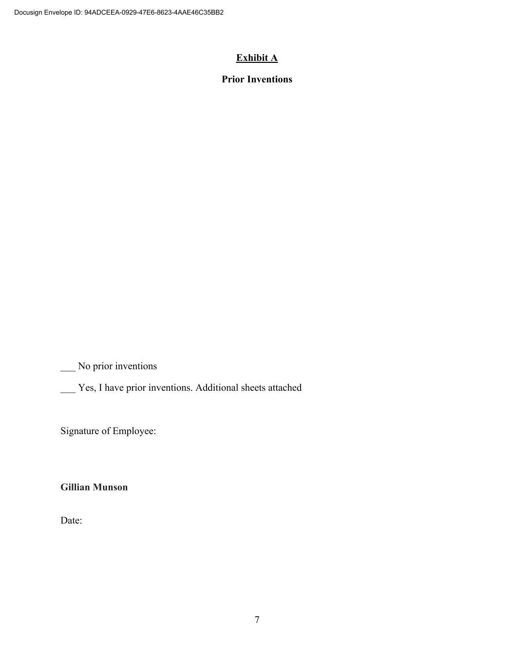7 Exhibit A Prior Inventions ___ No prior inventions ___ Yes, I have prior inventions. Additional sheets attached Signature of Employee: Gillian Munson Date: Docusign Envelope ID: 94ADCEEA-0929-47E6-8623-4AAE46C35BB2