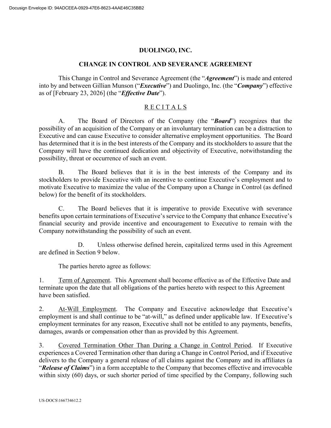 US-DOCS\166734612.2 DUOLINGO, INC. CHANGE IN CONTROL AND SEVERANCE AGREEMENT This Change in Control and Severance Agreement (the “Agreement”) is made and entered into by and between Gillian Munson (“Executive”) and Duolingo, Inc. (the “Company”) effective as of [February 23, 2026] (the “Effective Date”). R E C I T A L S A. The Board of Directors of the Company (the “Board”) recognizes that the possibility of an acquisition of the Company or an involuntary termination can be a distraction to Executive and can cause Executive to consider alternative employment opportunities. The Board has determined that it is in the best interests of the Company and its stockholders to assure that the Company will have the continued dedication and objectivity of Executive, notwithstanding the possibility, threat or occurrence of such an event. B. The Board believes that it is in the best interests of the Company and its stockholders to provide Executive with an incentive to continue Executive’s employment and to motivate Executive to maximize the value of the Company upon a Change in Control (as defined below) for the benefit of its stockholders. C. The Board believes that it is imperative to provide Executive with severance benefits upon certain terminations of Executive’s service to the Company that enhance Executive’s financial security and provide incentive and encouragement to Executive to remain with the Company notwithstanding the possibility of such an event. D. Unless otherwise defined herein, capitalized terms used in this Agreement are defined in Section 9 below. The parties hereto agree as follows: 1. Term of Agreement. This Agreement shall become effective as of the Effective Date and terminate upon the date that all obligations of the parties hereto with respect to this Agreement have been satisfied. 2. At-Will Employment. The Company and Executive acknowledge that Executive’s employment is and shall continue to be “at-will,” as defined under applicable law. If Executive’s employment terminates for any reason, Executive shall not be entitled to any payments, benefits, damages, awards or compensation other than as provided by this Agreement. 3. Covered Termination Other Than During a Change in Control Period. If Executive experiences a Covered Termination other than during a Change in Control Period, and if Executive delivers to the Company a general release of all claims against the Company and its affiliates (a “Release of Claims”) in a form acceptable to the Company that becomes effective and irrevocable within sixty (60) days, or such shorter period of time specified by the Company, following such Docusign Envelope ID: 94ADCEEA-0929-47E6-8623-4AAE46C35BB2