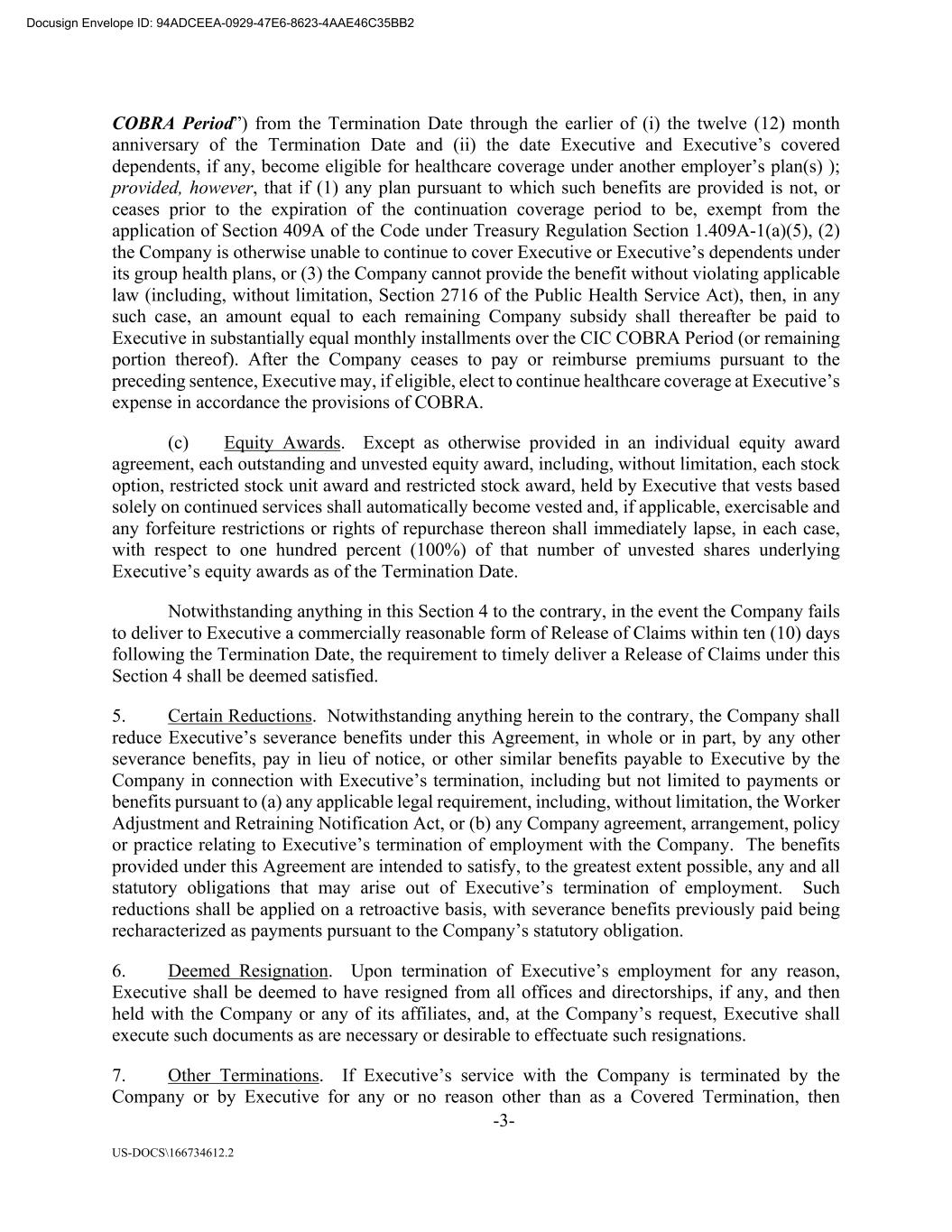 -3- US-DOCS\166734612.2 COBRA Period”) from the Termination Date through the earlier of (i) the twelve (12) month anniversary of the Termination Date and (ii) the date Executive and Executive’s covered dependents, if any, become eligible for healthcare coverage under another employer’s plan(s) ); provided, however, that if (1) any plan pursuant to which such benefits are provided is not, or ceases prior to the expiration of the continuation coverage period to be, exempt from the application of Section 409A of the Code under Treasury Regulation Section 1.409A-1(a)(5), (2) the Company is otherwise unable to continue to cover Executive or Executive’s dependents under its group health plans, or (3) the Company cannot provide the benefit without violating applicable law (including, without limitation, Section 2716 of the Public Health Service Act), then, in any such case, an amount equal to each remaining Company subsidy shall thereafter be paid to Executive in substantially equal monthly installments over the CIC COBRA Period (or remaining portion thereof). After the Company ceases to pay or reimburse premiums pursuant to the preceding sentence, Executive may, if eligible, elect to continue healthcare coverage at Executive’s expense in accordance the provisions of COBRA. (c) Equity Awards. Except as otherwise provided in an individual equity award agreement, each outstanding and unvested equity award, including, without limitation, each stock option, restricted stock unit award and restricted stock award, held by Executive that vests based solely on continued services shall automatically become vested and, if applicable, exercisable and any forfeiture restrictions or rights of repurchase thereon shall immediately lapse, in each case, with respect to one hundred percent (100%) of that number of unvested shares underlying Executive’s equity awards as of the Termination Date. Notwithstanding anything in this Section 4 to the contrary, in the event the Company fails to deliver to Executive a commercially reasonable form of Release of Claims within ten (10) days following the Termination Date, the requirement to timely deliver a Release of Claims under this Section 4 shall be deemed satisfied. 5. Certain Reductions. Notwithstanding anything herein to the contrary, the Company shall reduce Executive’s severance benefits under this Agreement, in whole or in part, by any other severance benefits, pay in lieu of notice, or other similar benefits payable to Executive by the Company in connection with Executive’s termination, including but not limited to payments or benefits pursuant to (a) any applicable legal requirement, including, without limitation, the Worker Adjustment and Retraining Notification Act, or (b) any Company agreement, arrangement, policy or practice relating to Executive’s termination of employment with the Company. The benefits provided under this Agreement are intended to satisfy, to the greatest extent possible, any and all statutory obligations that may arise out of Executive’s termination of employment. Such reductions shall be applied on a retroactive basis, with severance benefits previously paid being recharacterized as payments pursuant to the Company’s statutory obligation. 6. Deemed Resignation. Upon termination of Executive’s employment for any reason, Executive shall be deemed to have resigned from all offices and directorships, if any, and then held with the Company or any of its affiliates, and, at the Company’s request, Executive shall execute such documents as are necessary or desirable to effectuate such resignations. 7. Other Terminations. If Executive’s service with the Company is terminated by the Company or by Executive for any or no reason other than as a Covered Termination, then Docusign Envelope ID: 94ADCEEA-0929-47E6-8623-4AAE46C35BB2