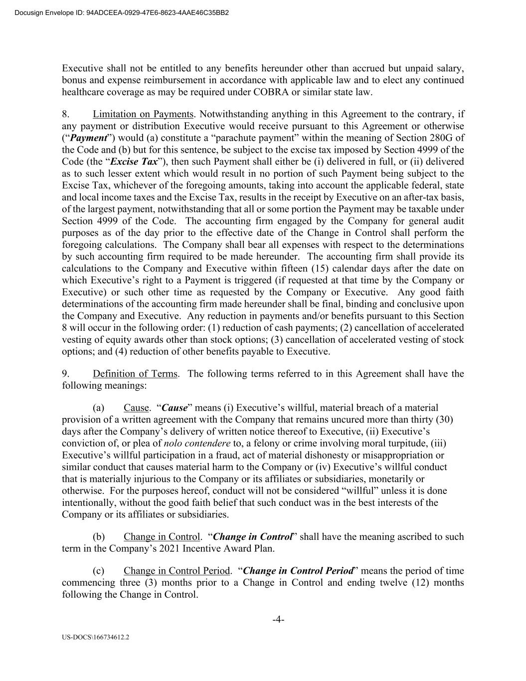 -4- US-DOCS\166734612.2 Executive shall not be entitled to any benefits hereunder other than accrued but unpaid salary, bonus and expense reimbursement in accordance with applicable law and to elect any continued healthcare coverage as may be required under COBRA or similar state law. 8. Limitation on Payments. Notwithstanding anything in this Agreement to the contrary, if any payment or distribution Executive would receive pursuant to this Agreement or otherwise (“Payment”) would (a) constitute a “parachute payment” within the meaning of Section 280G of the Code and (b) but for this sentence, be subject to the excise tax imposed by Section 4999 of the Code (the “Excise Tax”), then such Payment shall either be (i) delivered in full, or (ii) delivered as to such lesser extent which would result in no portion of such Payment being subject to the Excise Tax, whichever of the foregoing amounts, taking into account the applicable federal, state and local income taxes and the Excise Tax, results in the receipt by Executive on an after-tax basis, of the largest payment, notwithstanding that all or some portion the Payment may be taxable under Section 4999 of the Code. The accounting firm engaged by the Company for general audit purposes as of the day prior to the effective date of the Change in Control shall perform the foregoing calculations. The Company shall bear all expenses with respect to the determinations by such accounting firm required to be made hereunder. The accounting firm shall provide its calculations to the Company and Executive within fifteen (15) calendar days after the date on which Executive’s right to a Payment is triggered (if requested at that time by the Company or Executive) or such other time as requested by the Company or Executive. Any good faith determinations of the accounting firm made hereunder shall be final, binding and conclusive upon the Company and Executive. Any reduction in payments and/or benefits pursuant to this Section 8 will occur in the following order: (1) reduction of cash payments; (2) cancellation of accelerated vesting of equity awards other than stock options; (3) cancellation of accelerated vesting of stock options; and (4) reduction of other benefits payable to Executive. 9. Definition of Terms. The following terms referred to in this Agreement shall have the following meanings: (a) Cause. “Cause” means (i) Executive’s willful, material breach of a material provision of a written agreement with the Company that remains uncured more than thirty (30) days after the Company’s delivery of written notice thereof to Executive, (ii) Executive’s conviction of, or plea of nolo contendere to, a felony or crime involving moral turpitude, (iii) Executive’s willful participation in a fraud, act of material dishonesty or misappropriation or similar conduct that causes material harm to the Company or (iv) Executive’s willful conduct that is materially injurious to the Company or its affiliates or subsidiaries, monetarily or otherwise. For the purposes hereof, conduct will not be considered “willful” unless it is done intentionally, without the good faith belief that such conduct was in the best interests of the Company or its affiliates or subsidiaries. (b) Change in Control. “Change in Control” shall have the meaning ascribed to such term in the Company’s 2021 Incentive Award Plan. (c) Change in Control Period. “Change in Control Period” means the period of time commencing three (3) months prior to a Change in Control and ending twelve (12) months following the Change in Control. Docusign Envelope ID: 94ADCEEA-0929-47E6-8623-4AAE46C35BB2