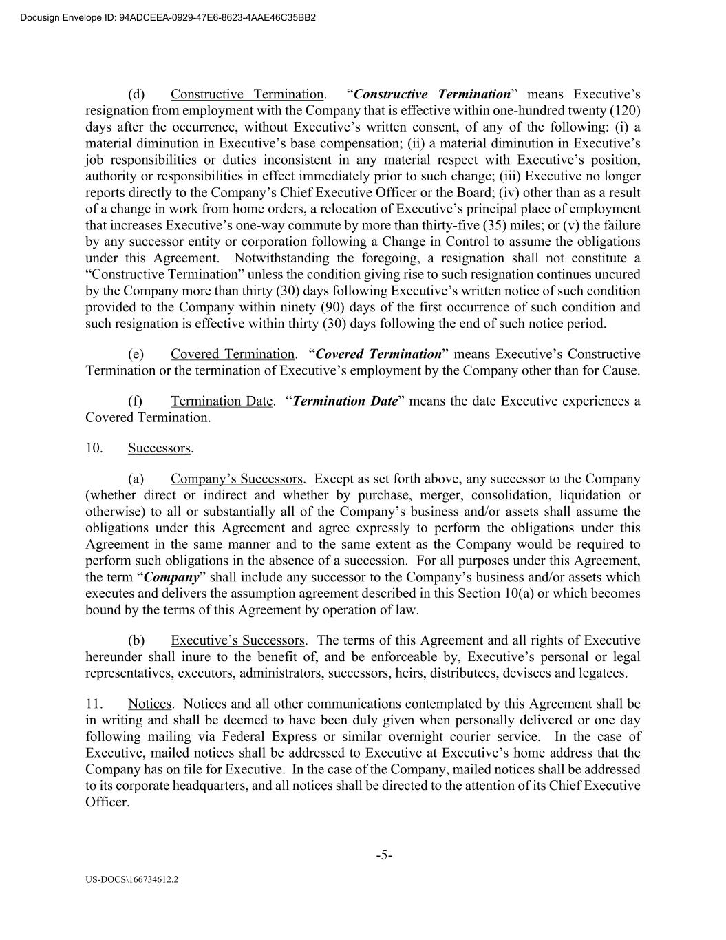 -5- US-DOCS\166734612.2 (d) Constructive Termination. “Constructive Termination” means Executive’s resignation from employment with the Company that is effective within one-hundred twenty (120) days after the occurrence, without Executive’s written consent, of any of the following: (i) a material diminution in Executive’s base compensation; (ii) a material diminution in Executive’s job responsibilities or duties inconsistent in any material respect with Executive’s position, authority or responsibilities in effect immediately prior to such change; (iii) Executive no longer reports directly to the Company’s Chief Executive Officer or the Board; (iv) other than as a result of a change in work from home orders, a relocation of Executive’s principal place of employment that increases Executive’s one-way commute by more than thirty-five (35) miles; or (v) the failure by any successor entity or corporation following a Change in Control to assume the obligations under this Agreement. Notwithstanding the foregoing, a resignation shall not constitute a “Constructive Termination” unless the condition giving rise to such resignation continues uncured by the Company more than thirty (30) days following Executive’s written notice of such condition provided to the Company within ninety (90) days of the first occurrence of such condition and such resignation is effective within thirty (30) days following the end of such notice period. (e) Covered Termination. “Covered Termination” means Executive’s Constructive Termination or the termination of Executive’s employment by the Company other than for Cause. (f) Termination Date. “Termination Date” means the date Executive experiences a Covered Termination. 10. Successors. (a) Company’s Successors. Except as set forth above, any successor to the Company (whether direct or indirect and whether by purchase, merger, consolidation, liquidation or otherwise) to all or substantially all of the Company’s business and/or assets shall assume the obligations under this Agreement and agree expressly to perform the obligations under this Agreement in the same manner and to the same extent as the Company would be required to perform such obligations in the absence of a succession. For all purposes under this Agreement, the term “Company” shall include any successor to the Company’s business and/or assets which executes and delivers the assumption agreement described in this Section 10(a) or which becomes bound by the terms of this Agreement by operation of law. (b) Executive’s Successors. The terms of this Agreement and all rights of Executive hereunder shall inure to the benefit of, and be enforceable by, Executive’s personal or legal representatives, executors, administrators, successors, heirs, distributees, devisees and legatees. 11. Notices. Notices and all other communications contemplated by this Agreement shall be in writing and shall be deemed to have been duly given when personally delivered or one day following mailing via Federal Express or similar overnight courier service. In the case of Executive, mailed notices shall be addressed to Executive at Executive’s home address that the Company has on file for Executive. In the case of the Company, mailed notices shall be addressed to its corporate headquarters, and all notices shall be directed to the attention of its Chief Executive Officer. Docusign Envelope ID: 94ADCEEA-0929-47E6-8623-4AAE46C35BB2