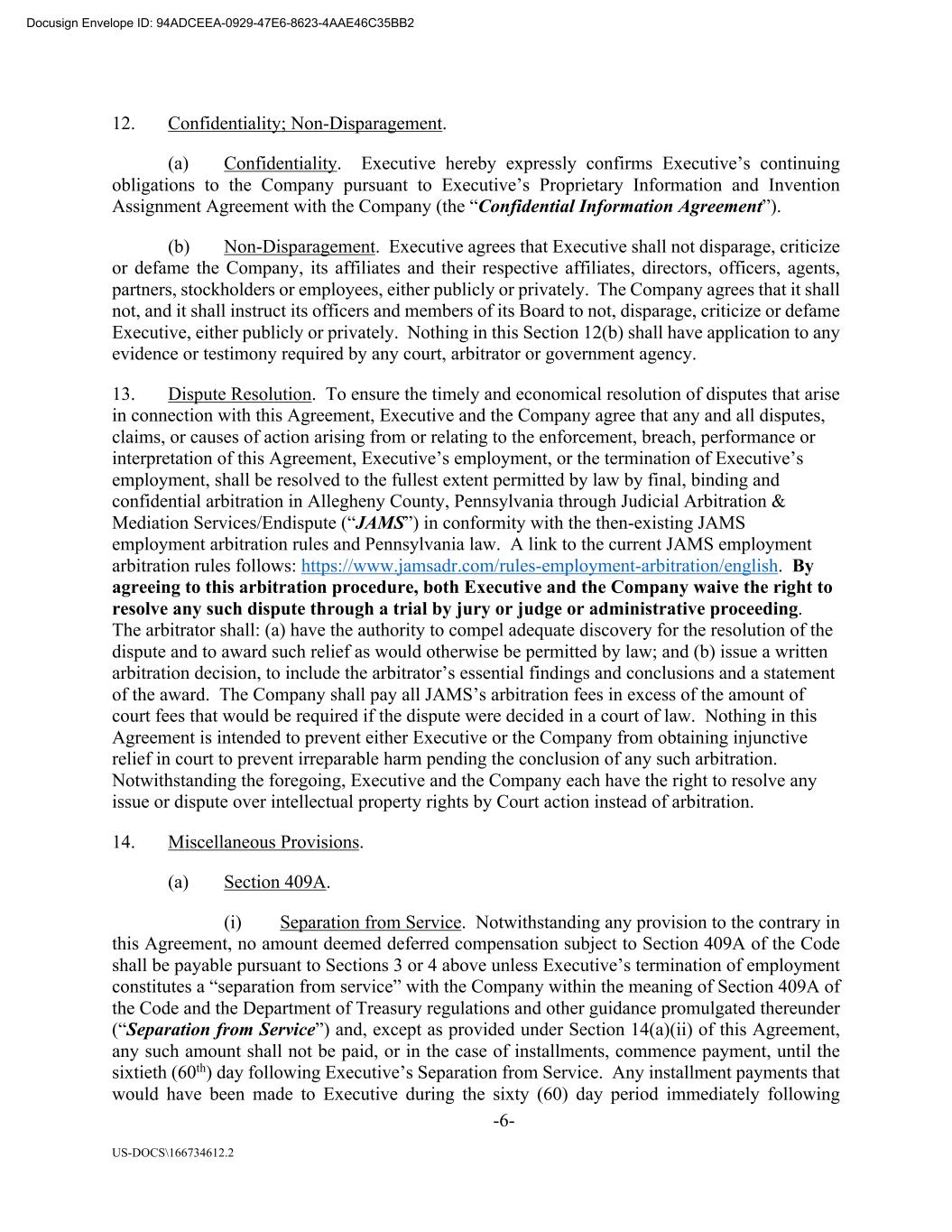 -6- US-DOCS\166734612.2 12. Confidentiality; Non-Disparagement. (a) Confidentiality. Executive hereby expressly confirms Executive’s continuing obligations to the Company pursuant to Executive’s Proprietary Information and Invention Assignment Agreement with the Company (the “Confidential Information Agreement”). (b) Non-Disparagement. Executive agrees that Executive shall not disparage, criticize or defame the Company, its affiliates and their respective affiliates, directors, officers, agents, partners, stockholders or employees, either publicly or privately. The Company agrees that it shall not, and it shall instruct its officers and members of its Board to not, disparage, criticize or defame Executive, either publicly or privately. Nothing in this Section 12(b) shall have application to any evidence or testimony required by any court, arbitrator or government agency. 13. Dispute Resolution. To ensure the timely and economical resolution of disputes that arise in connection with this Agreement, Executive and the Company agree that any and all disputes, claims, or causes of action arising from or relating to the enforcement, breach, performance or interpretation of this Agreement, Executive’s employment, or the termination of Executive’s employment, shall be resolved to the fullest extent permitted by law by final, binding and confidential arbitration in Allegheny County, Pennsylvania through Judicial Arbitration & Mediation Services/Endispute (“JAMS”) in conformity with the then-existing JAMS employment arbitration rules and Pennsylvania law. A link to the current JAMS employment arbitration rules follows: https://www.jamsadr.com/rules-employment-arbitration/english. By agreeing to this arbitration procedure, both Executive and the Company waive the right to resolve any such dispute through a trial by jury or judge or administrative proceeding. The arbitrator shall: (a) have the authority to compel adequate discovery for the resolution of the dispute and to award such relief as would otherwise be permitted by law; and (b) issue a written arbitration decision, to include the arbitrator’s essential findings and conclusions and a statement of the award. The Company shall pay all JAMS’s arbitration fees in excess of the amount of court fees that would be required if the dispute were decided in a court of law. Nothing in this Agreement is intended to prevent either Executive or the Company from obtaining injunctive relief in court to prevent irreparable harm pending the conclusion of any such arbitration. Notwithstanding the foregoing, Executive and the Company each have the right to resolve any issue or dispute over intellectual property rights by Court action instead of arbitration. 14. Miscellaneous Provisions. (a) Section 409A. (i) Separation from Service. Notwithstanding any provision to the contrary in this Agreement, no amount deemed deferred compensation subject to Section 409A of the Code shall be payable pursuant to Sections 3 or 4 above unless Executive’s termination of employment constitutes a “separation from service” with the Company within the meaning of Section 409A of the Code and the Department of Treasury regulations and other guidance promulgated thereunder (“Separation from Service”) and, except as provided under Section 14(a)(ii) of this Agreement, any such amount shall not be paid, or in the case of installments, commence payment, until the sixtieth (60th) day following Executive’s Separation from Service. Any installment payments that would have been made to Executive during the sixty (60) day period immediately following Docusign Envelope ID: 94ADCEEA-0929-47E6-8623-4AAE46C35BB2