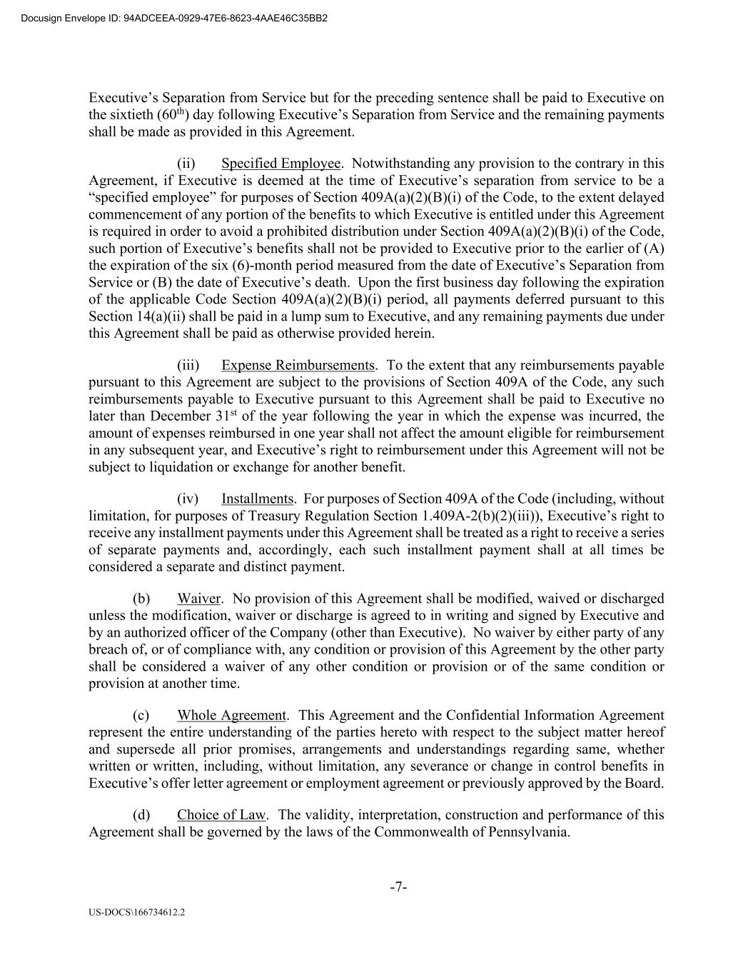 -7- US-DOCS\166734612.2 Executive’s Separation from Service but for the preceding sentence shall be paid to Executive on the sixtieth (60th) day following Executive’s Separation from Service and the remaining payments shall be made as provided in this Agreement. (ii) Specified Employee. Notwithstanding any provision to the contrary in this Agreement, if Executive is deemed at the time of Executive’s separation from service to be a “specified employee” for purposes of Section 409A(a)(2)(B)(i) of the Code, to the extent delayed commencement of any portion of the benefits to which Executive is entitled under this Agreement is required in order to avoid a prohibited distribution under Section 409A(a)(2)(B)(i) of the Code, such portion of Executive’s benefits shall not be provided to Executive prior to the earlier of (A) the expiration of the six (6)-month period measured from the date of Executive’s Separation from Service or (B) the date of Executive’s death. Upon the first business day following the expiration of the applicable Code Section 409A(a)(2)(B)(i) period, all payments deferred pursuant to this Section 14(a)(ii) shall be paid in a lump sum to Executive, and any remaining payments due under this Agreement shall be paid as otherwise provided herein. (iii) Expense Reimbursements. To the extent that any reimbursements payable pursuant to this Agreement are subject to the provisions of Section 409A of the Code, any such reimbursements payable to Executive pursuant to this Agreement shall be paid to Executive no later than December 31st of the year following the year in which the expense was incurred, the amount of expenses reimbursed in one year shall not affect the amount eligible for reimbursement in any subsequent year, and Executive’s right to reimbursement under this Agreement will not be subject to liquidation or exchange for another benefit. (iv) Installments. For purposes of Section 409A of the Code (including, without limitation, for purposes of Treasury Regulation Section 1.409A-2(b)(2)(iii)), Executive’s right to receive any installment payments under this Agreement shall be treated as a right to receive a series of separate payments and, accordingly, each such installment payment shall at all times be considered a separate and distinct payment. (b) Waiver. No provision of this Agreement shall be modified, waived or discharged unless the modification, waiver or discharge is agreed to in writing and signed by Executive and by an authorized officer of the Company (other than Executive). No waiver by either party of any breach of, or of compliance with, any condition or provision of this Agreement by the other party shall be considered a waiver of any other condition or provision or of the same condition or provision at another time. (c) Whole Agreement. This Agreement and the Confidential Information Agreement represent the entire understanding of the parties hereto with respect to the subject matter hereof and supersede all prior promises, arrangements and understandings regarding same, whether written or written, including, without limitation, any severance or change in control benefits in Executive’s offer letter agreement or employment agreement or previously approved by the Board. (d) Choice of Law. The validity, interpretation, construction and performance of this Agreement shall be governed by the laws of the Commonwealth of Pennsylvania. Docusign Envelope ID: 94ADCEEA-0929-47E6-8623-4AAE46C35BB2