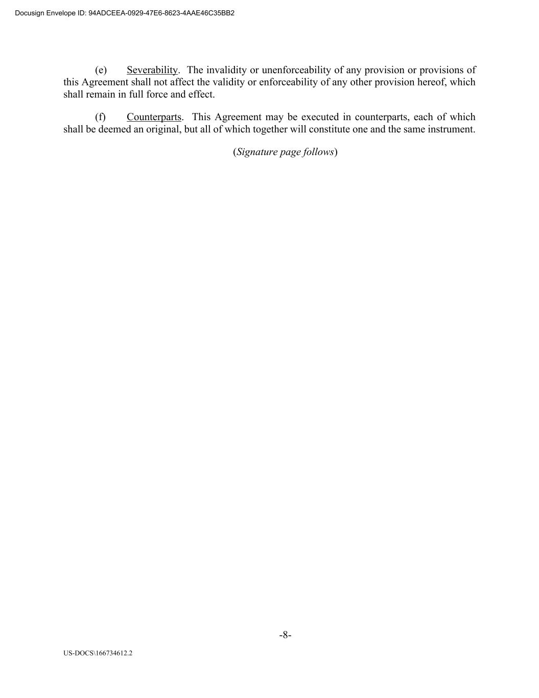 -8- US-DOCS\166734612.2 (e) Severability. The invalidity or unenforceability of any provision or provisions of this Agreement shall not affect the validity or enforceability of any other provision hereof, which shall remain in full force and effect. (f) Counterparts. This Agreement may be executed in counterparts, each of which shall be deemed an original, but all of which together will constitute one and the same instrument. (Signature page follows) Docusign Envelope ID: 94ADCEEA-0929-47E6-8623-4AAE46C35BB2